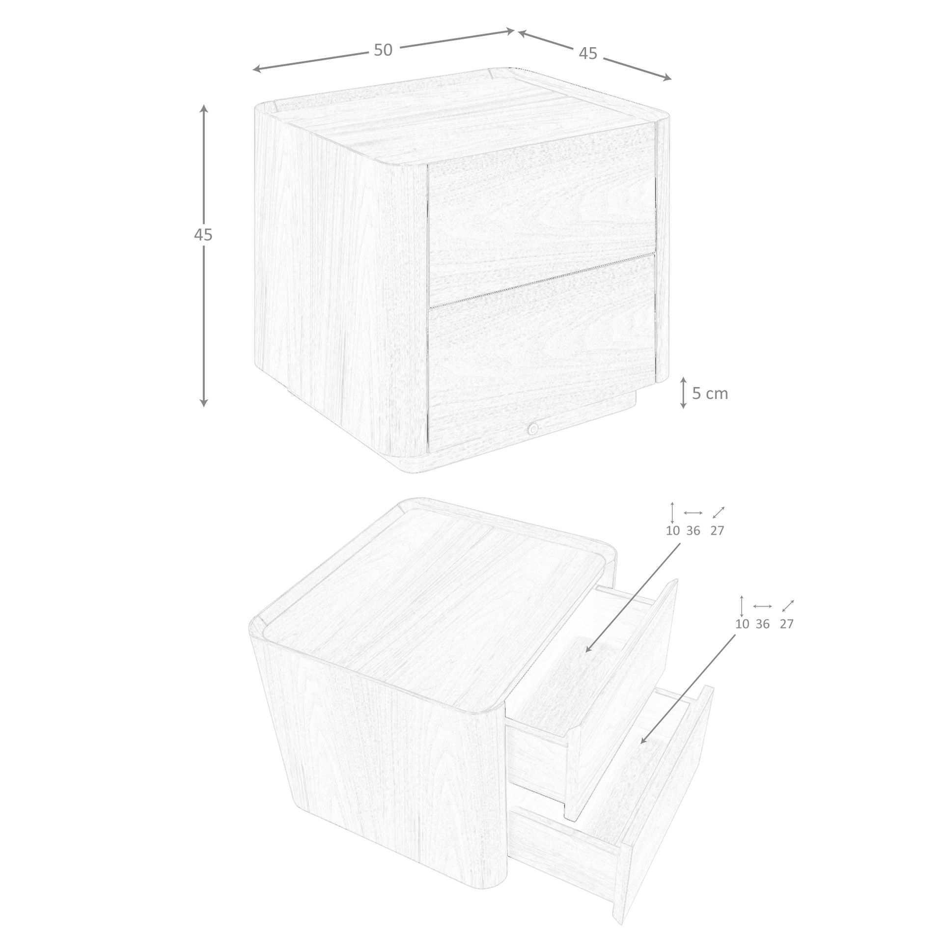Mesita de noche nogal con iluminación modelo 7165 Angel Cerdá S.L.Mesita de noche de diseño moderno con estructura de madera chapada en nogal natural y una original base de madera chapada en color nogal. La iluminación de esta mesita de noche le permitirá crear un ambiente cálido y relajado, a la vez que ofrece una mayor practicidad y funcionalidad. Cuenta con un amplio espacio de almacenaje con 2 cajones con sistema de apertura uñero y cierre soft-closing. Medidas del producto: 50 x 45 x 45 cm.- Esta elegante mesita de noche de madera chapada en nogal natural de 0,5 mm de espesor, aportará el toque diferente y moderno que busca para su dormitorio. – Versátil y funcional, su diseño permite que encaje en cualquier ambiente, convirtiéndose en un elemento clave de la decoración de su hogar. – Tanto por su tamaño como por su espacio de almacenaje es ideal para mantener todo en orden y en su sitio. – Cuenta con sensor de iluminación led, convirtiéndola en un mueble auxiliar único, versátil y repleo de estilo.