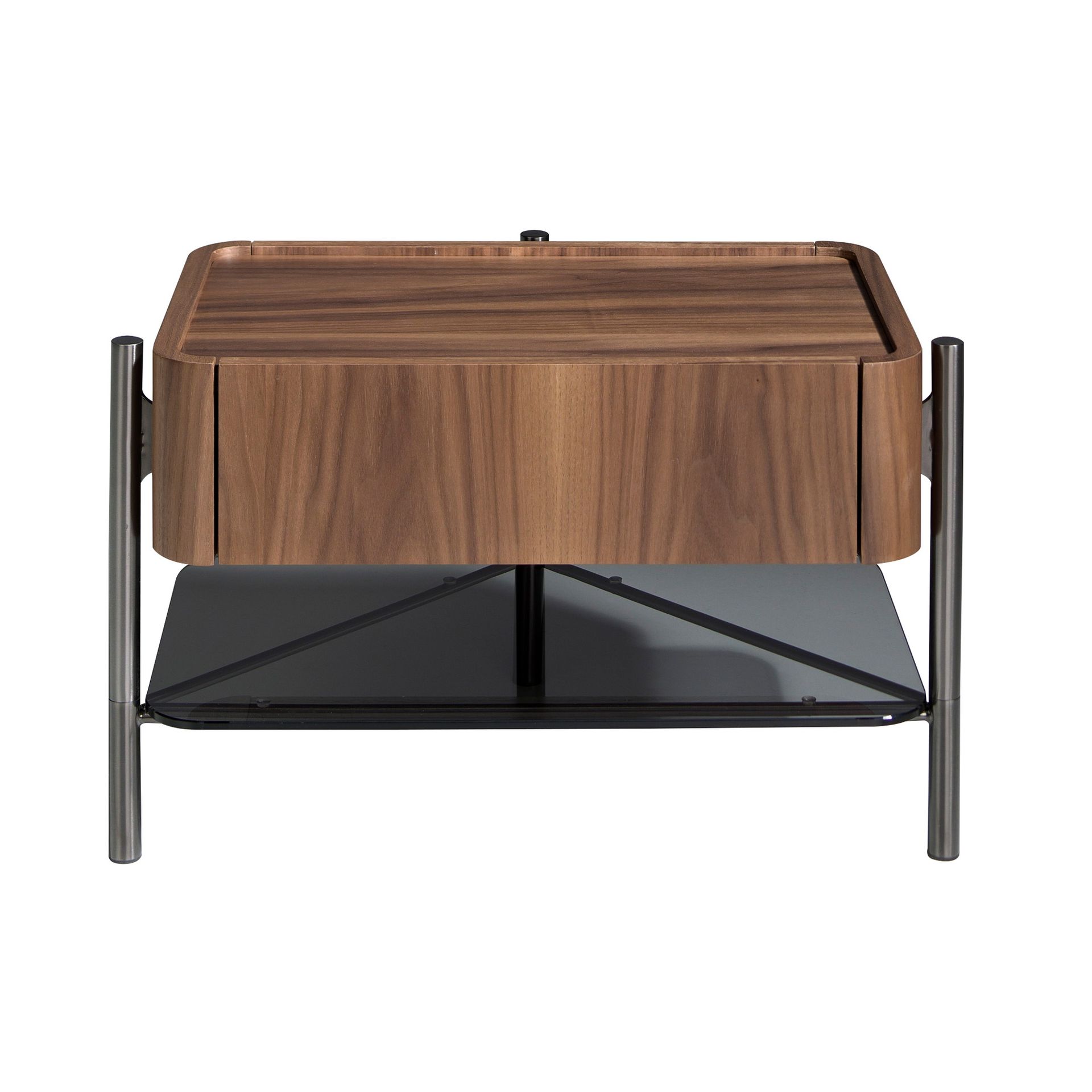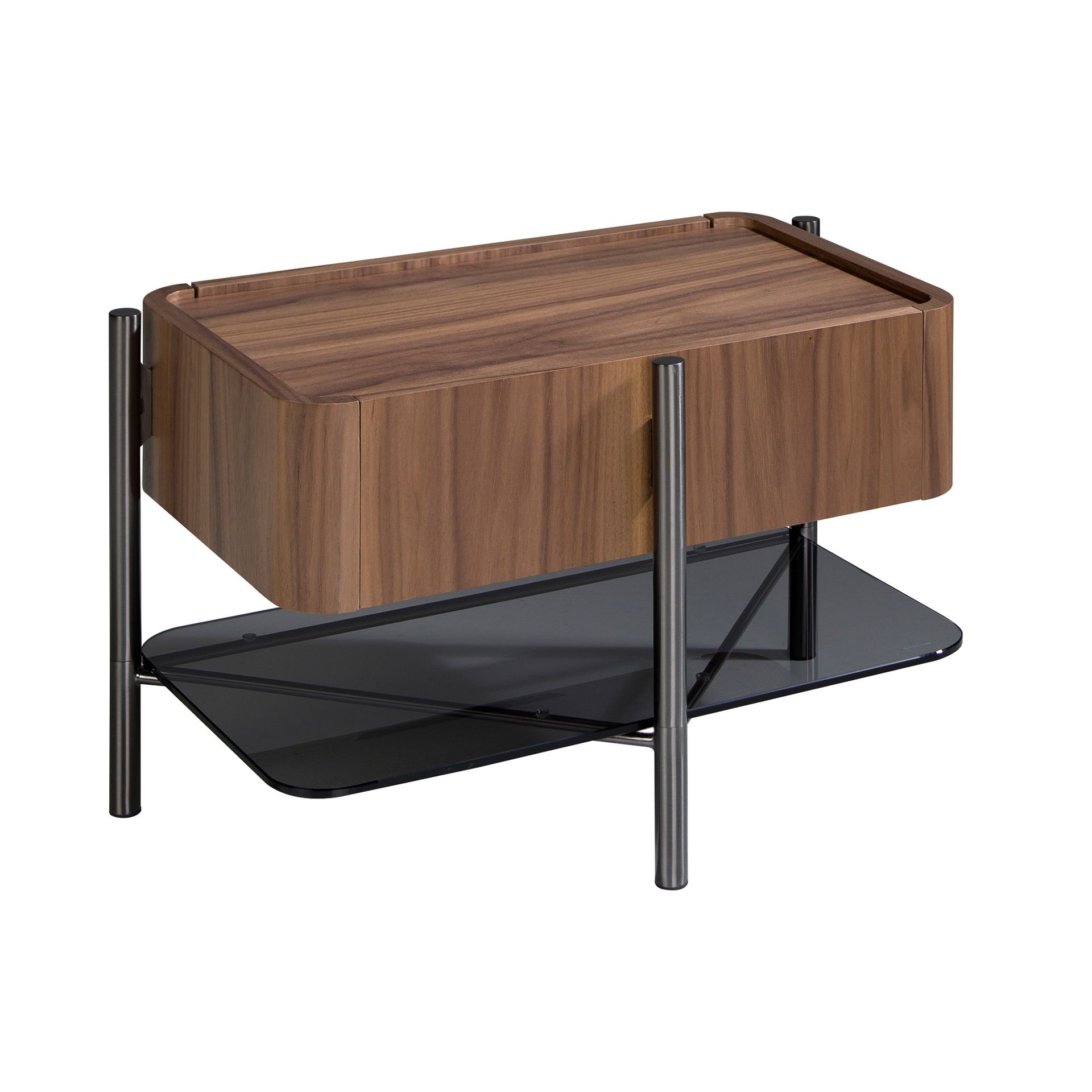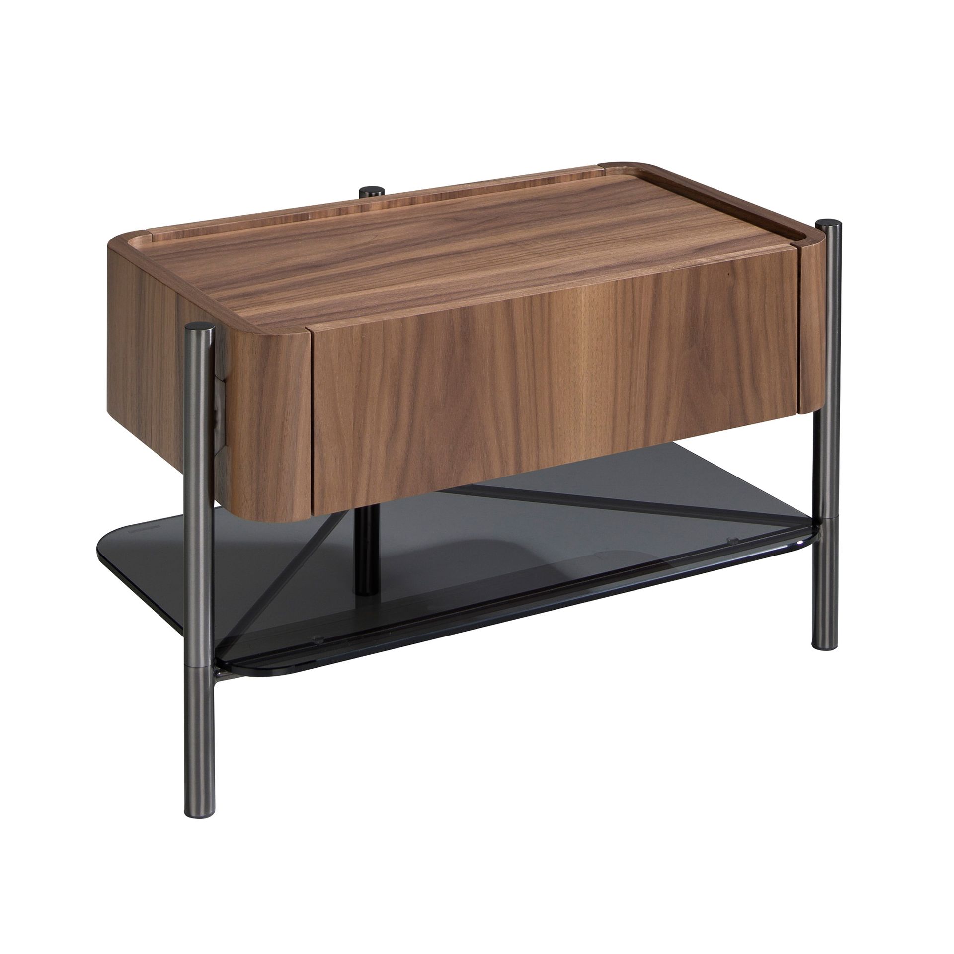 Mesita de noche nogal y acero oscuro modelo 7138 Angel Cerdá S.L.Mesita de noche de diseño moderno con estructura de madera chapada en nogal natural y unas originales patas de acero inoxidable oscurecido. Su original detalle en cristal fumé en color negro aporta el toque de estilo ideal para tu salón. Cuenta con un amplio espacio de almacenaje con 1 cajón con sistema de apertura uñero y cierre soft-closing. Medidas del producto: 65 x 39 x 39 cm.- Esta elegante mesita de noche de madera chapada en nogal natural de 0,5 mm de espesor, aportará el toque diferente y moderno que busca para su dormitorio. – El acero de sus patas, así como su diseño lineal, permite que encaje en cualquier espacio de su hogar. – Versátil y funcional, su diseño permite que encaje en cualquier ambiente, convirtiéndose en un elemento clave de la decoración de su hogar. – Tanto por su tamaño como por su espacio de almacenaje es ideal para mantener todo en orden y en su sitio.