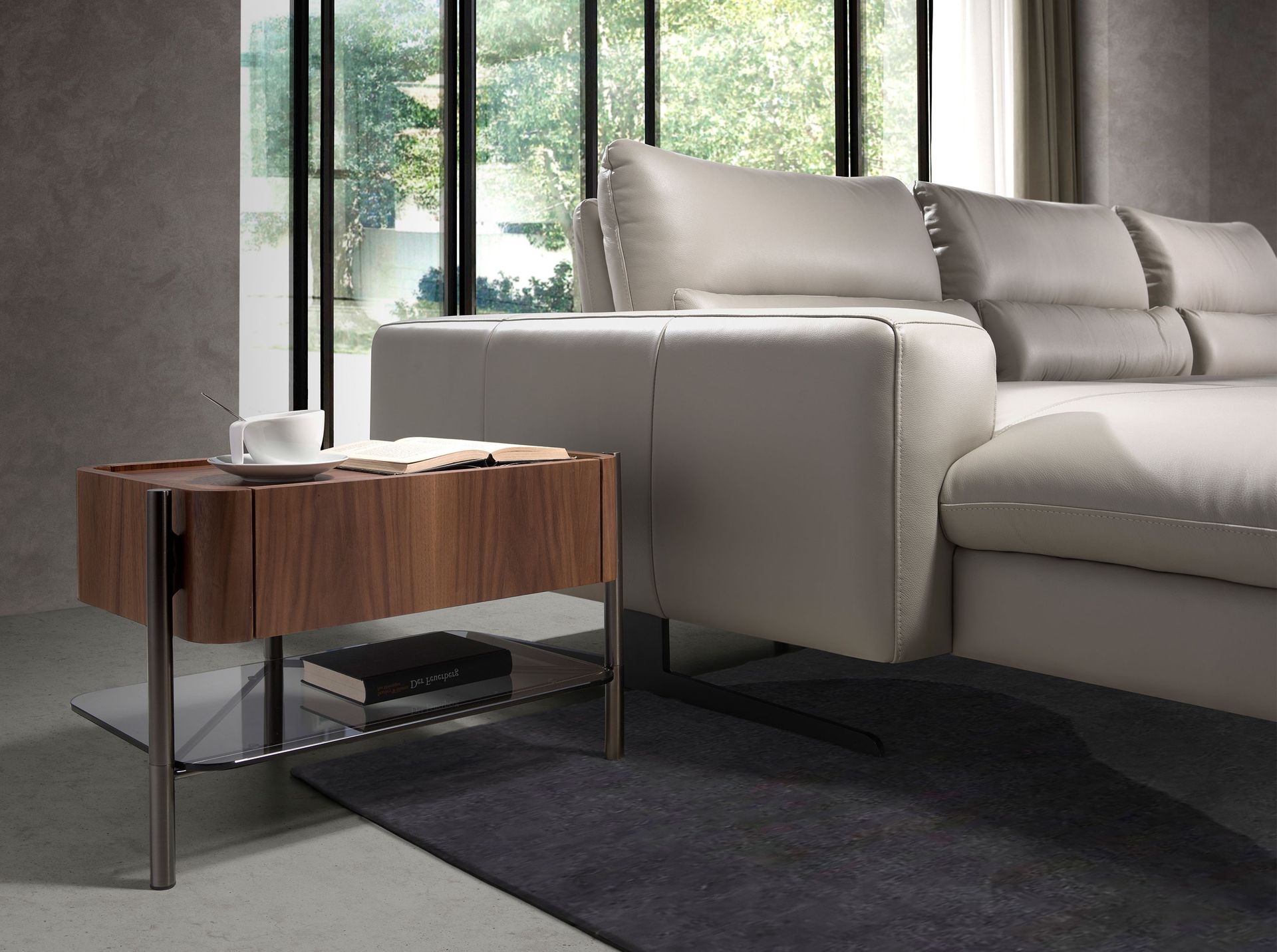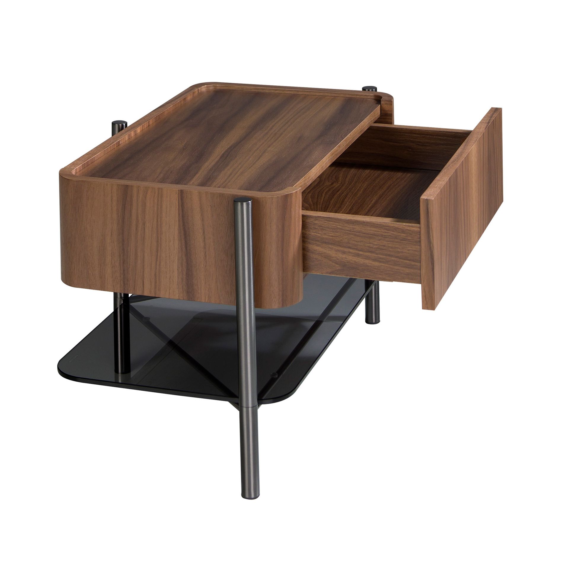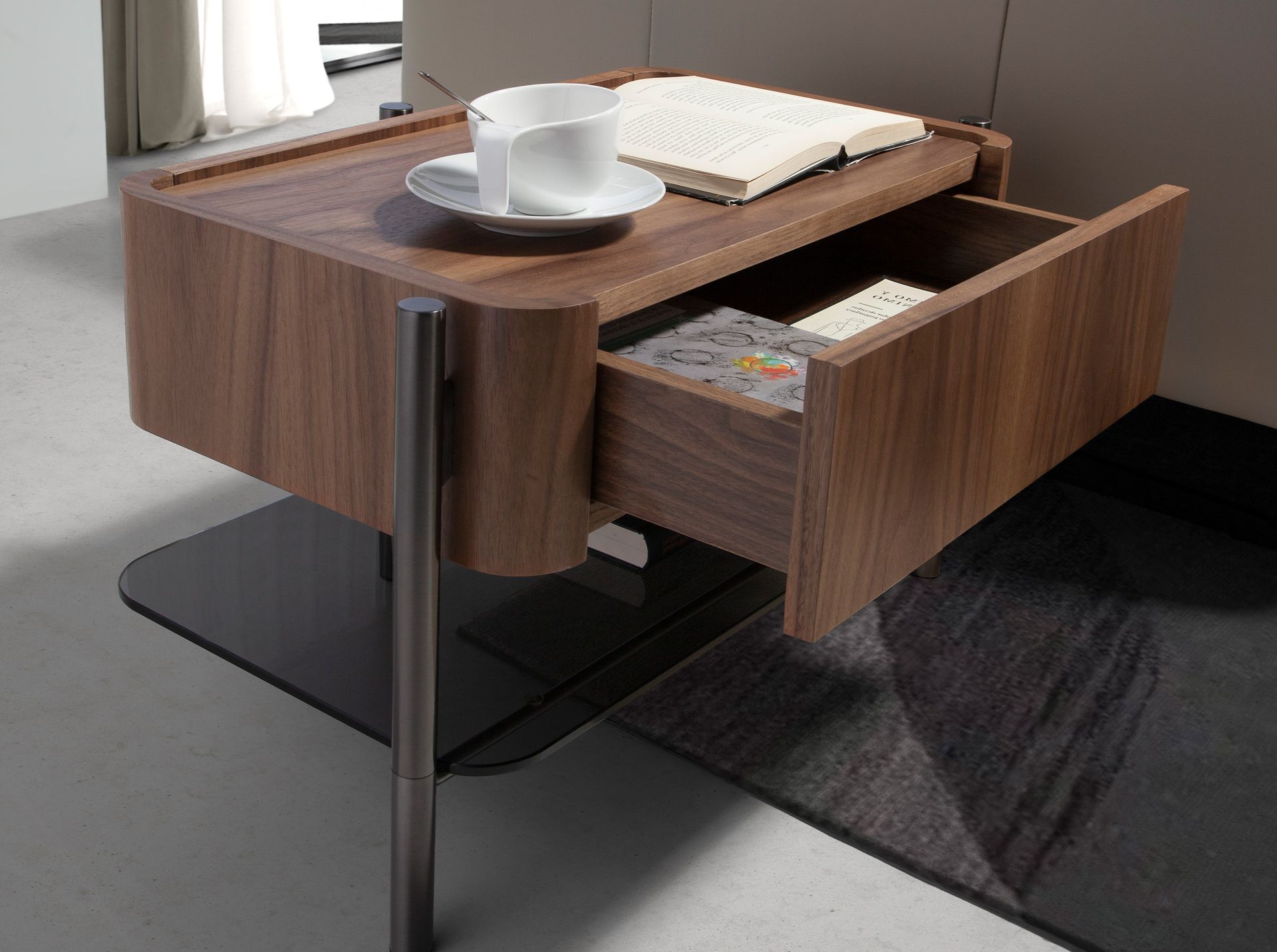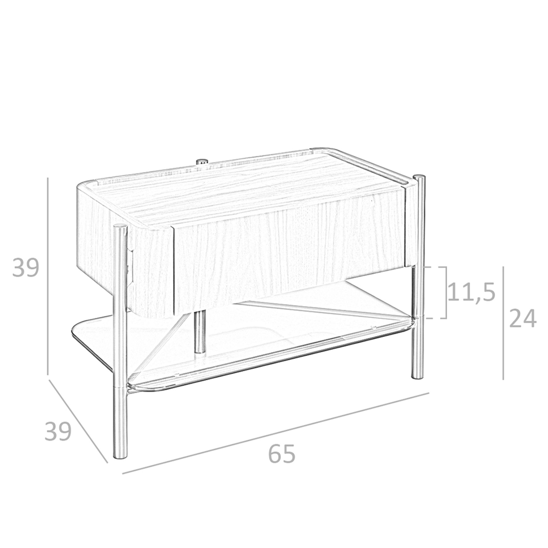 Mesita de noche nogal y acero oscuro modelo 7138 Angel Cerdá S.L.Mesita de noche de diseño moderno con estructura de madera chapada en nogal natural y unas originales patas de acero inoxidable oscurecido. Su original detalle en cristal fumé en color negro aporta el toque de estilo ideal para tu salón. Cuenta con un amplio espacio de almacenaje con 1 cajón con sistema de apertura uñero y cierre soft-closing. Medidas del producto: 65 x 39 x 39 cm.- Esta elegante mesita de noche de madera chapada en nogal natural de 0,5 mm de espesor, aportará el toque diferente y moderno que busca para su dormitorio. – El acero de sus patas, así como su diseño lineal, permite que encaje en cualquier espacio de su hogar. – Versátil y funcional, su diseño permite que encaje en cualquier ambiente, convirtiéndose en un elemento clave de la decoración de su hogar. – Tanto por su tamaño como por su espacio de almacenaje es ideal para mantener todo en orden y en su sitio.