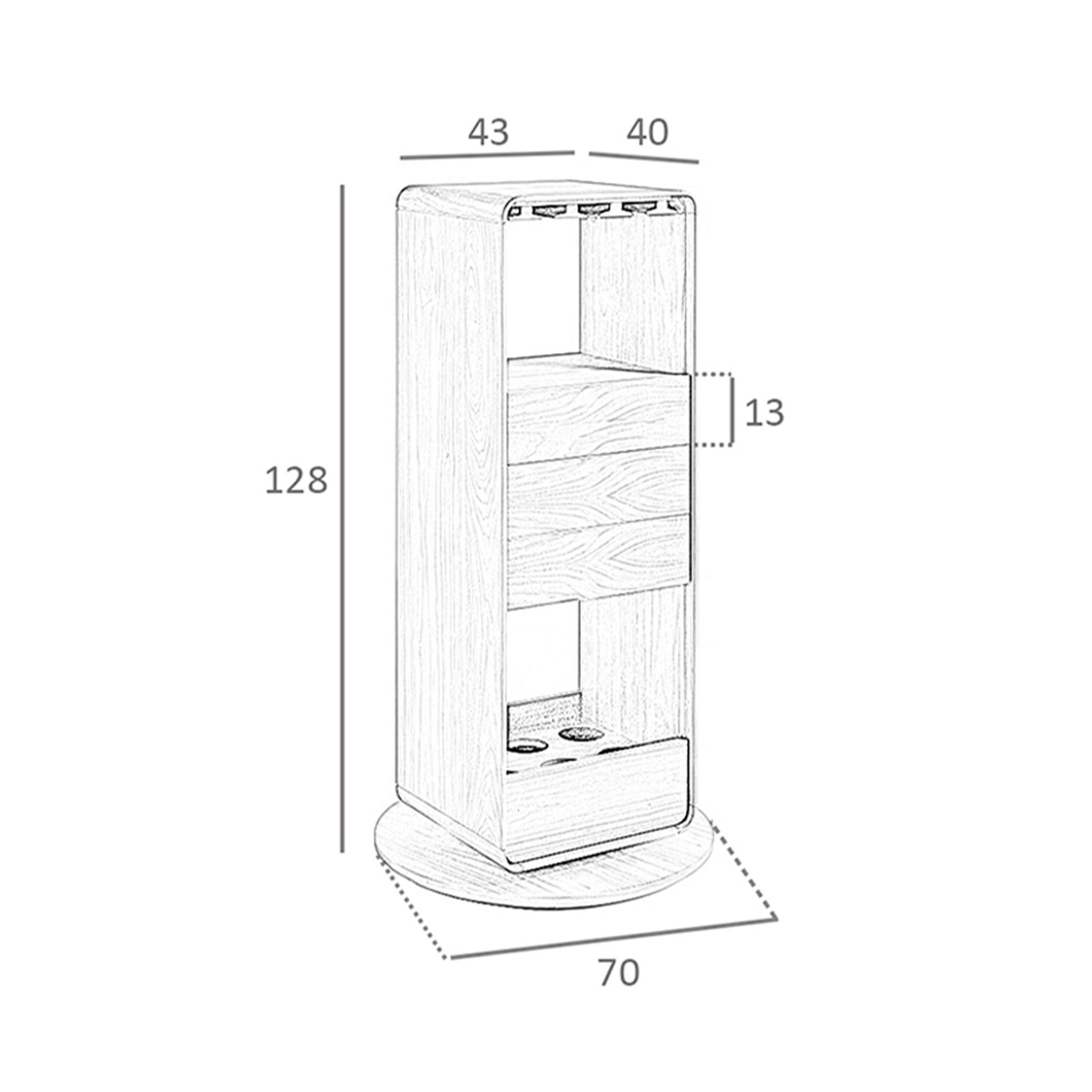 Mueble bar giratorio nogal modelo 3115 Angel Cerdá S.L.Mueble bar circular giratorio 360º fabricado en madera chapada en nogal con 3 cajones laterales. Dispone de listones superiores de madera maciza de fresno con soporte para copas y espacio inferior para 6 botellas.Medidas del producto: 43 x 40 x 128 cm.- Este original mueble bar de diseño moderno giratorio 360º aportará el toque diferente y sofisticado que buscas para tu salón y comedor.- Gracias a su acabado de diseño es ideal para combinar con las últimas tendencias en decoración. – Tanto por su diseño como por su acabado en madera chapada en nogal, se trata de un mueble auxiliar versátil y funcional perfecto para cualquier salón o comedor, así como para los restaurantes y bares más elegantes. – Todos nuestros muebles de bar están fabricados con materiales de la más alta calidad, siendo garantía de mobiliario duradero y funcional. – El diseño sencillo a la vez que exquisito de este mueble bar lo convierte en una pieza clave para tu estancia. La madera de nogal, aportará calidez a tus estancias.- Su elegante diseño no está reñido con la funcionalidad, y es que contarás con un gran espacio de almacenamiento, con sus tres cajones laterales con sistema de apertura push y cierre soft-closing, y su soporte superior para copas y espacio para 6 botellas, te permitirá crear un ambiente de diseño, a la vez que mantienes todo en orden y en su sitio.