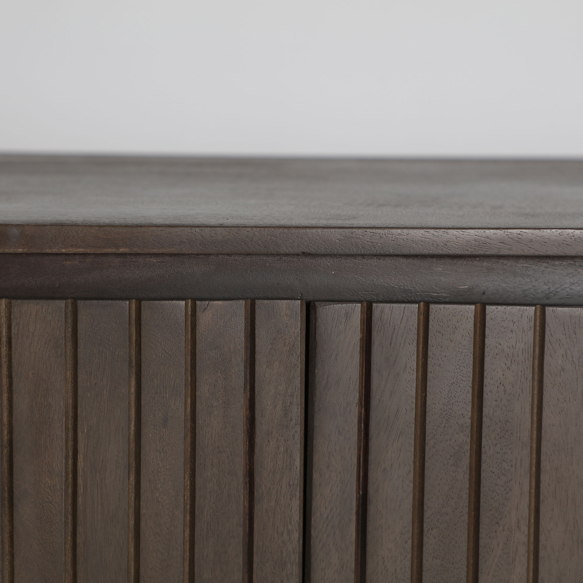 Mueble tv oval kolga de estilo art deco, fabricado en madera de mango en color marrón.