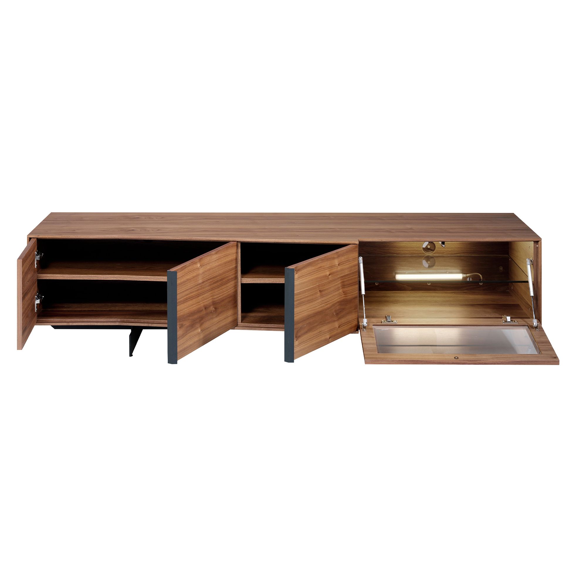 Mueble TV nogal y acero negro con iluminación interior | – Material de la estructura: Madera chapada en nogal natural de 0,5 mm de espesor- Material del acabado: Madera chapada en nogal natural de 0,5 mm de espesor- Material de las patas: Acero inoxidable pintado en epoxi negro- Material del detalle: Acero inoxidable pintado en epoxi negro- Material de las baldas: Madera chapada en nogal natural de 0,5 mm de espesor