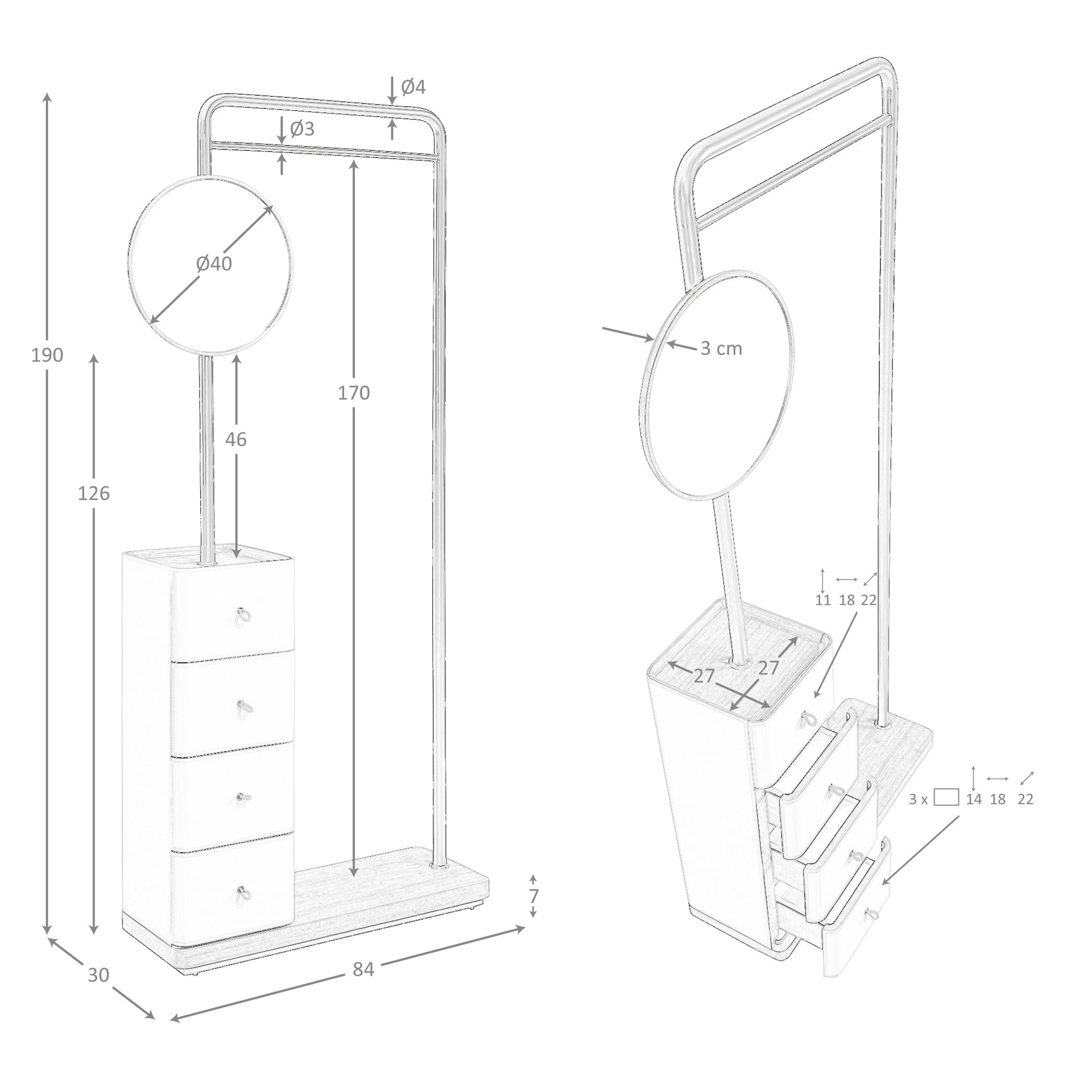 Perchero polipiel visón, nogal y acero negro con espejo modelo 3281 Angel Cerdá S.L.Perchero de diseño moderno fabricado en madera chapada en nogal natural, combinado con un elegante tapizado en polipiel color visón. El diseño de su base y estructura de acero inoxidable color negro aportará un toque sofisticado y exclusivo a su estancia. Cuenta con un práctico espejo ideal para disfrutar de forma relajada y tranquila de su momento de cuidado personal.Gracias a su amplio espacio de almacenaje con 4 cajones con sistema de apertura tirador de lengüeta y cierre soft-closing, le permitirá mantener todo en orden y en su sitio. Medidas del producto: 84 x 30 x 190 cm.- Tanto por su tamaño como por su gran espacio de almacenaje podrás mantener todo ordenado y en su sitio, eliminando el ruido visual de tus estancias. – Su estructura fabricada en acero color negro, permite colgar perchas o cualquier elemento para dar espacio a tu dormitorio.- Ofrece cuatro cajones tapizados en polipiel color visón, ideal para guardar todo lo que necesites.- Incluye un espejo redondo práctico para el día a día, con el que aportarás una mayor sensación de amplitud y luminosidad al espacio.- Su base combinada en madera chapada en nogal y acero inoxidable pulido, aporta no solo un acabado cálido y elegante, sino también una superficie estable que garantiza el equilibrio del perchero.