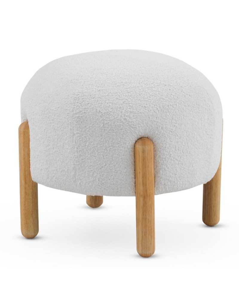 PUF TAPIZADO EN BOUCLE BLANCO CON ESTRUCTURA Y PATAS EN MADERA P