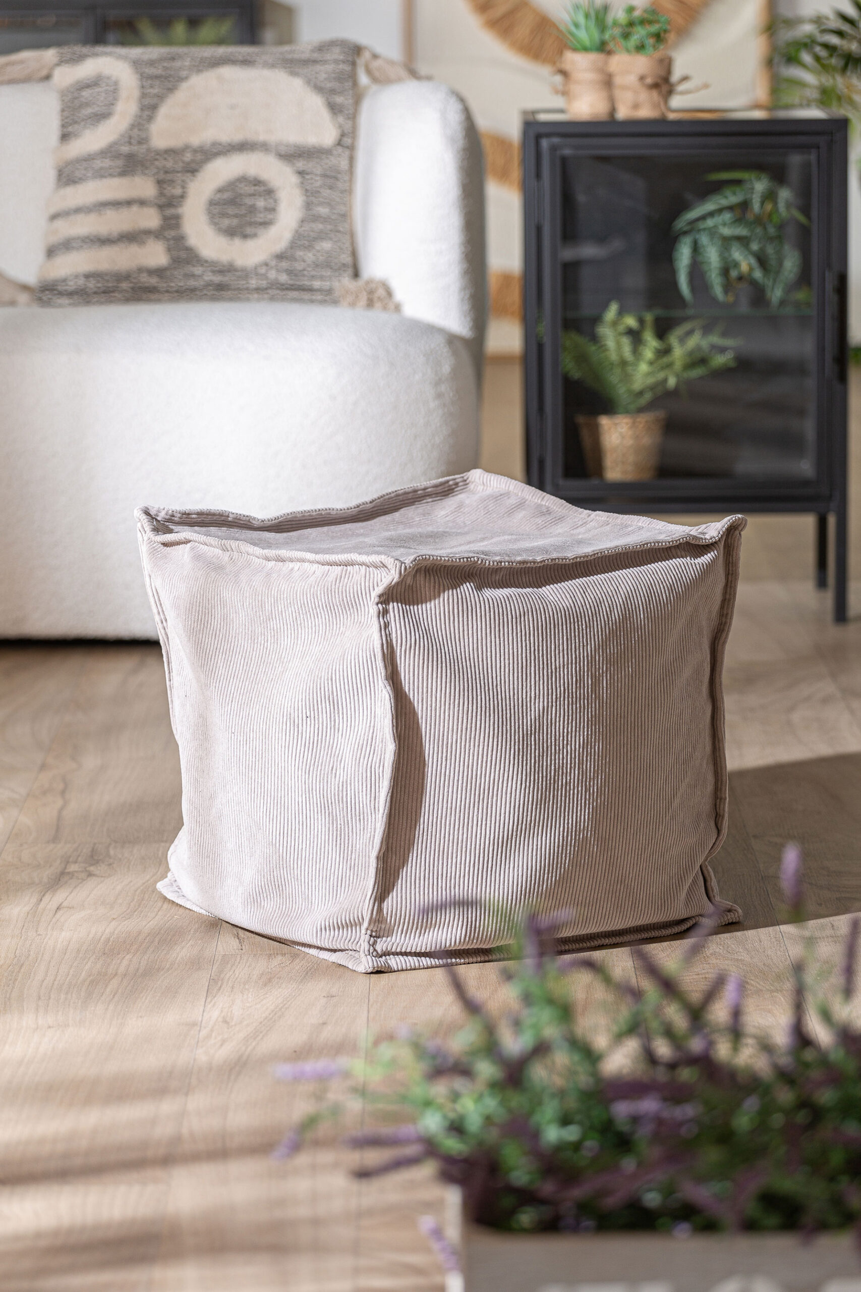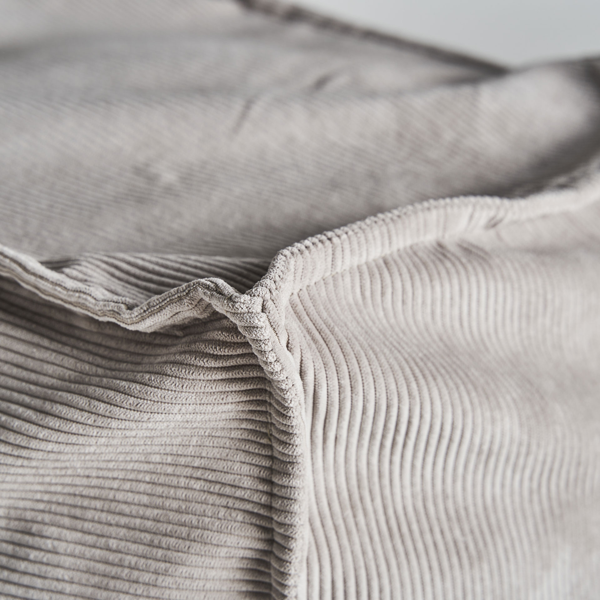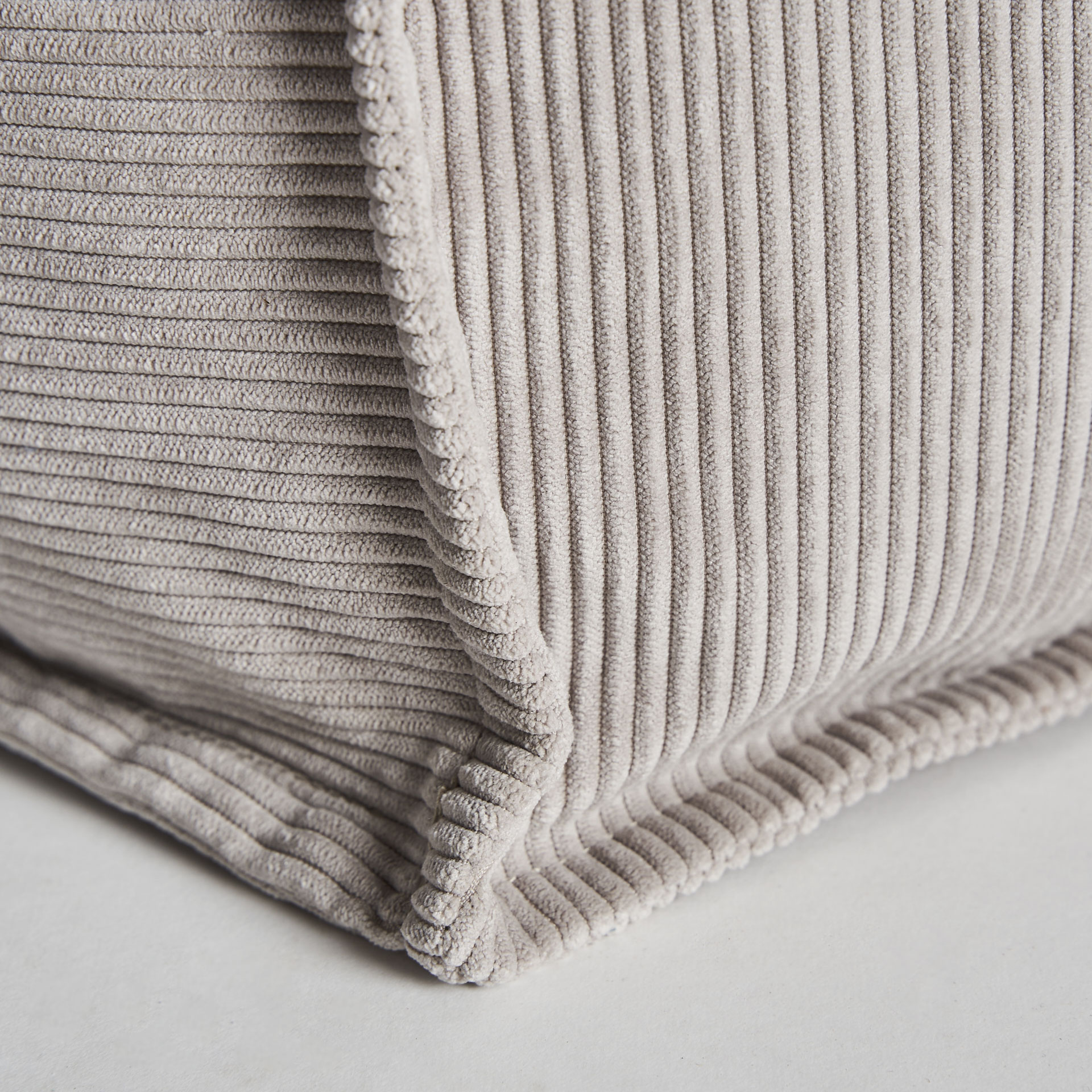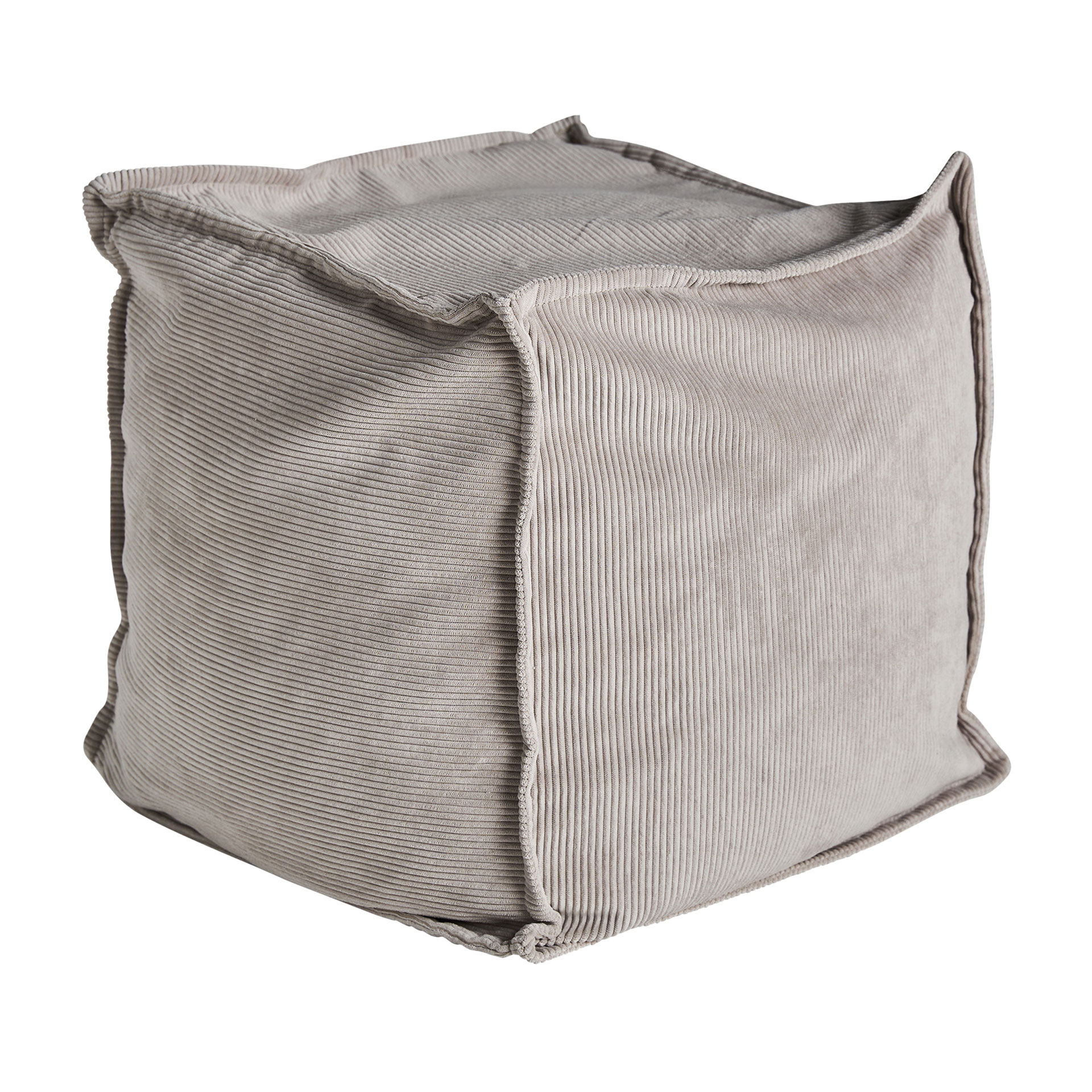 Reposapiés cuadrado seia de estilo shabby chic, fabricado en tela pana en color gris, combinado con espuma. Producto desenfundable.