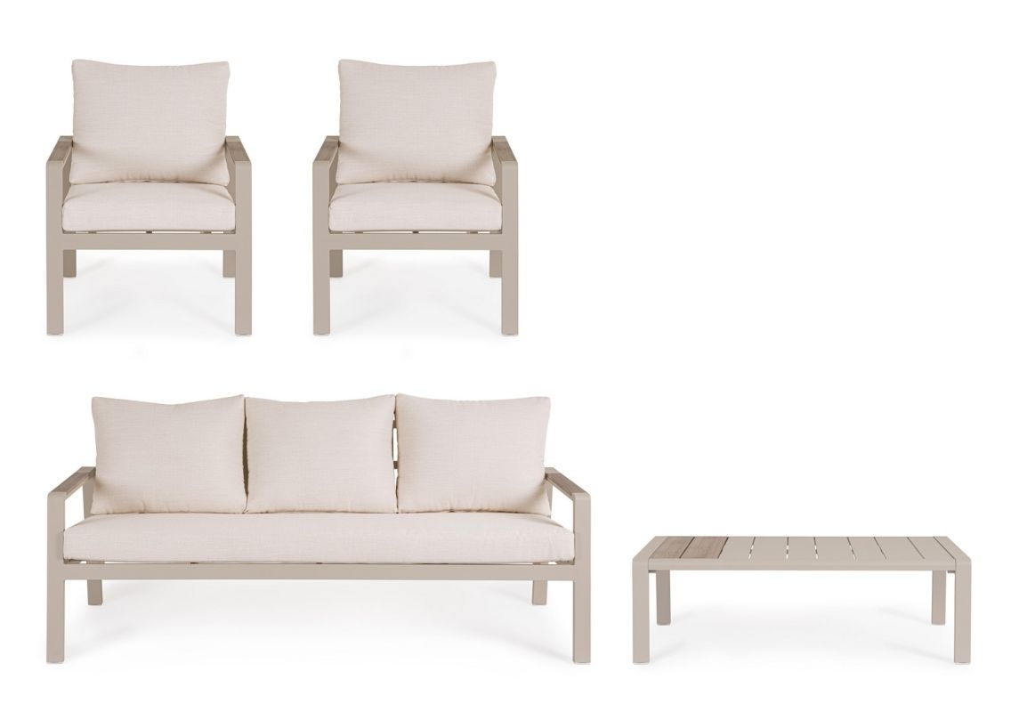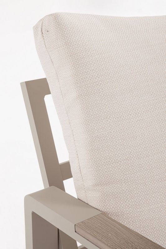 ESTRUCTURA DE ALUMINIO, BARNIZADO CON POLVO (POLIESTÉR). REPOSABRAZOS Y TABLERO DE LA MESA CENTRO CON INSERCIONES DE POLYWOOD. COJINES DESENFUNDABLES CON TEJIDO REPELENTE AL AGUA SPUN POLY (POLIESTÉR). PARA MONTAR.