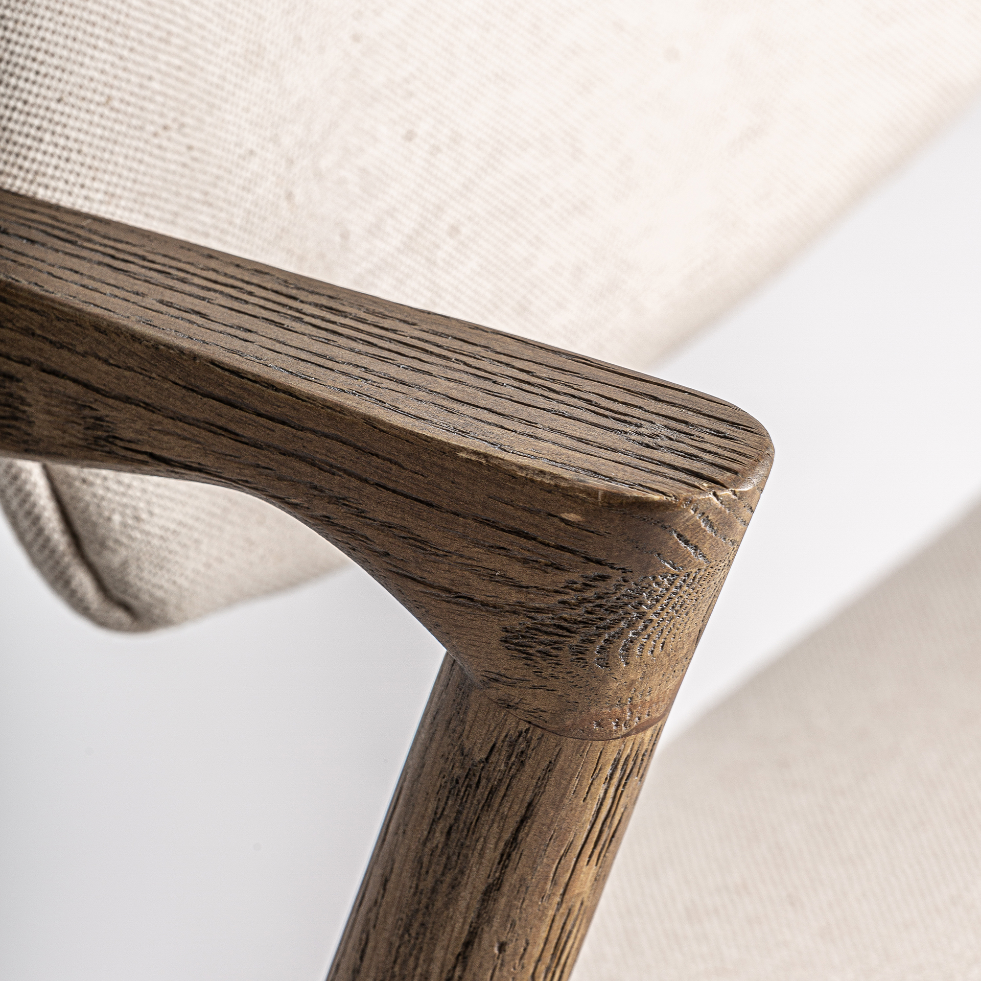 Silla polch de estilo art deco fabricado en lino en color marrón beige combinado con algodón y madera de fresno.