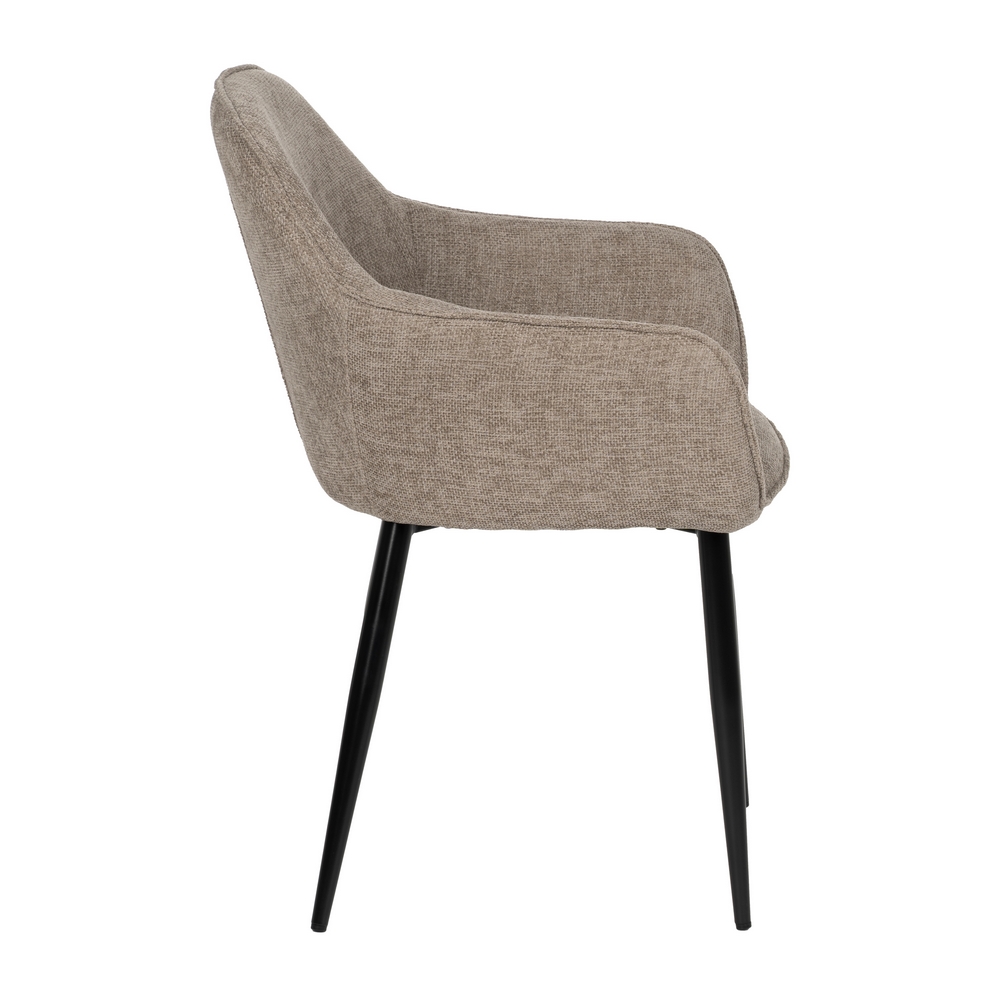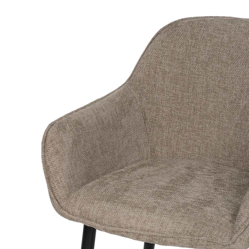 SILLA TAUPE TEJIDO-METAL CONTRACT 61 X 59,50 X 83 CM Tejido: Poliéster. Relleno:foam Densidad del relleno: 28kg/m3. Material de las patas: Hierro Altura del asiento:49,5cm Altura de las patas:42cm. Altura del respaldo: 37 cm. Altura de los brazos desde el asiento:16,5cm Altura de los brazos desde el suelo:64,5cm. Medidas del asiento: 42×43.5x7cm. Distancia entre las patas: 39 cm. Peso máximo soportado:140kgs. No apilable. Las patas requieren montaje. Cumple normativa EN16139:2013 (Catering).