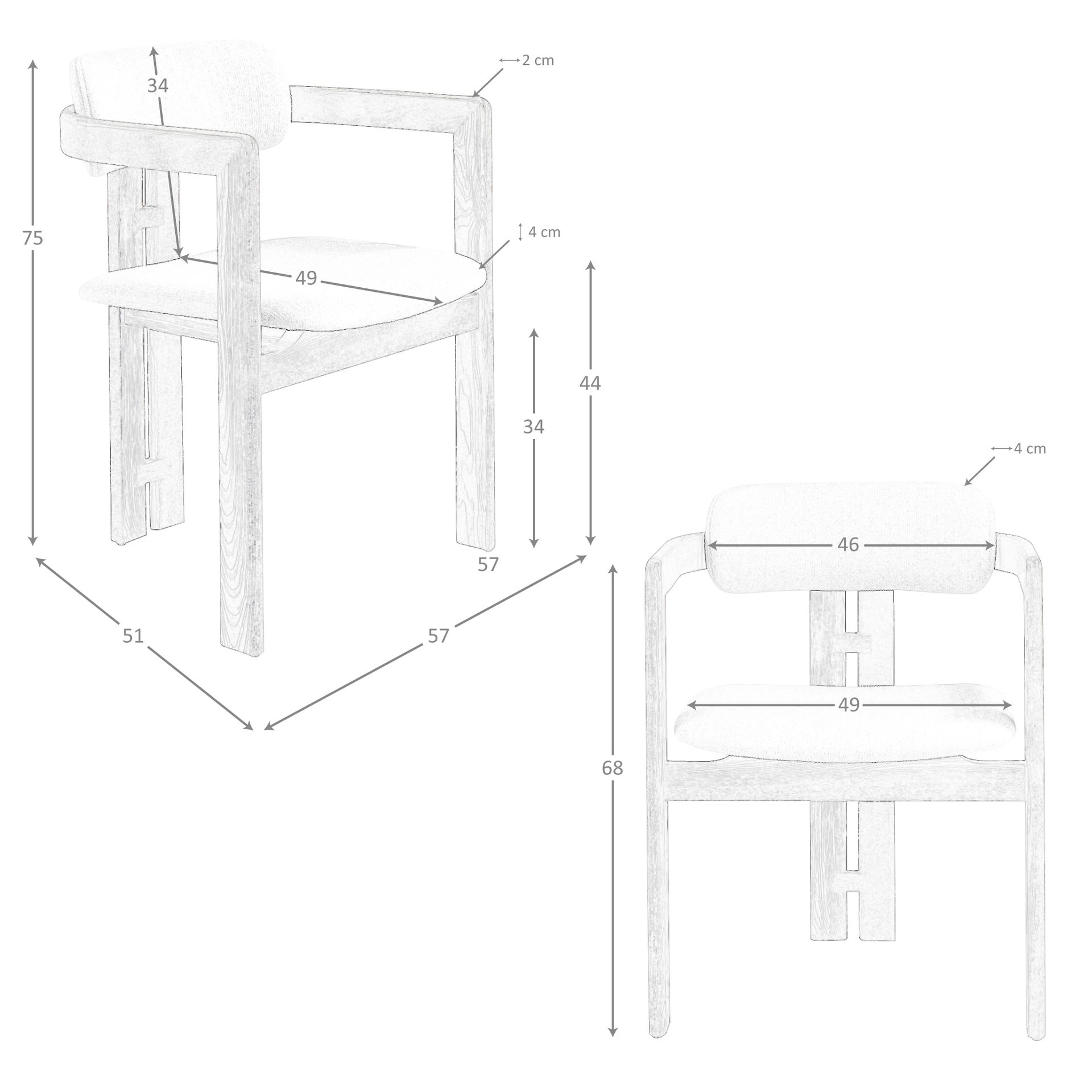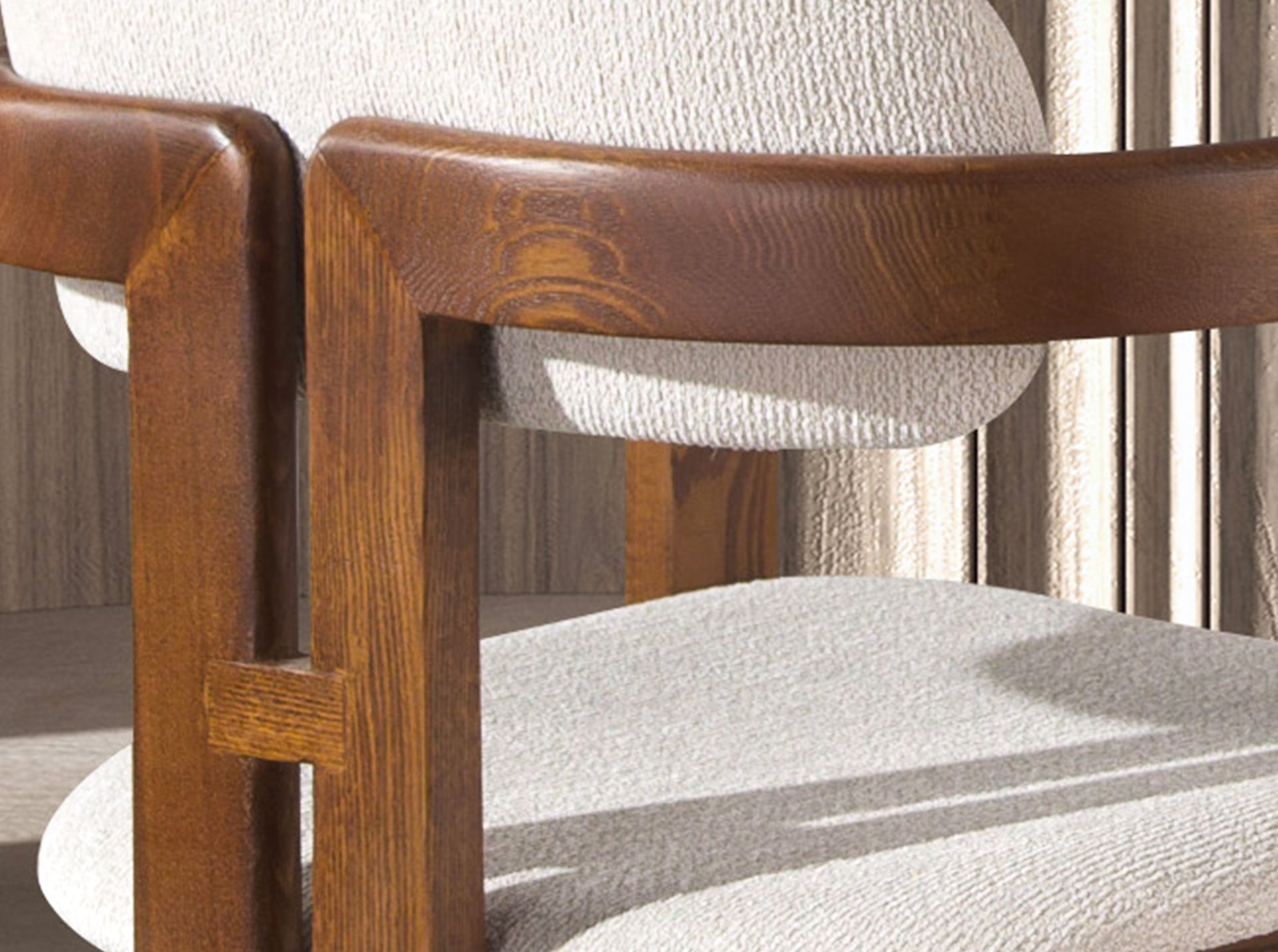 Silla tela blanco roto modelo 4194 Angel Cerdá S.L.Silla con reposabrazos de diseño moderno con asiento y respaldo tapizados en tela color blanco roto. Sus patas de madera en color nogal de estilo vanguardista a la vez que atemporal, la convertirán en el must have de su cocina o comedor. Esta silla de la firma Angel Cerdá, aúna el estilo único y personal de la marca, así como la mayor comodidad y estabilidad, gracias a la alta calidad de su tapizado y la original estructura de patas.Medidas del producto: 57 x 51 x 75 cm.- Gracias al tapizado en tela de esta silla de comedor, conseguirá el toque distintivo y diferente que busca para su zona de comedor. – Su estructura geométrica de líneas puras aporta solidez visual y elegancia contemporánea, ideal para ambientes modernos y sofisticados. – Diseño moderno y funcional en madera maciza, con líneas limpias y respaldo ergonómico que combina estilo y confort en cualquier ambiente. – Tanto por el tamaño de su asiento y su relleno en espuma de poliuretano de 25kg/m3, así como su cómodo respaldo le permitirá contar con el máximo confort, sin dejar de lado el diseño más actual.