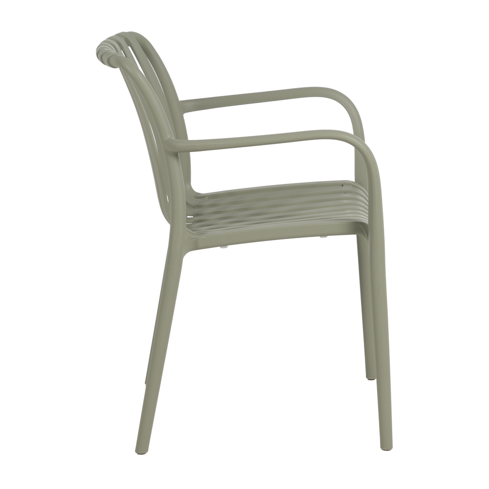 SILLA VERDE POLIPROPILENO EXTERIOR 56 X 57 X 81 CM Material: polipropileno. Altura asiento: 46cm. Ancho asiento: 45cm. Profundidad asiento: 41cm. Altura respaldo: 40cm. Altura reposabrazos: 20cm (67cm desde el suelo). Apilable. Cumple la normativa EN581 (uso exterior).