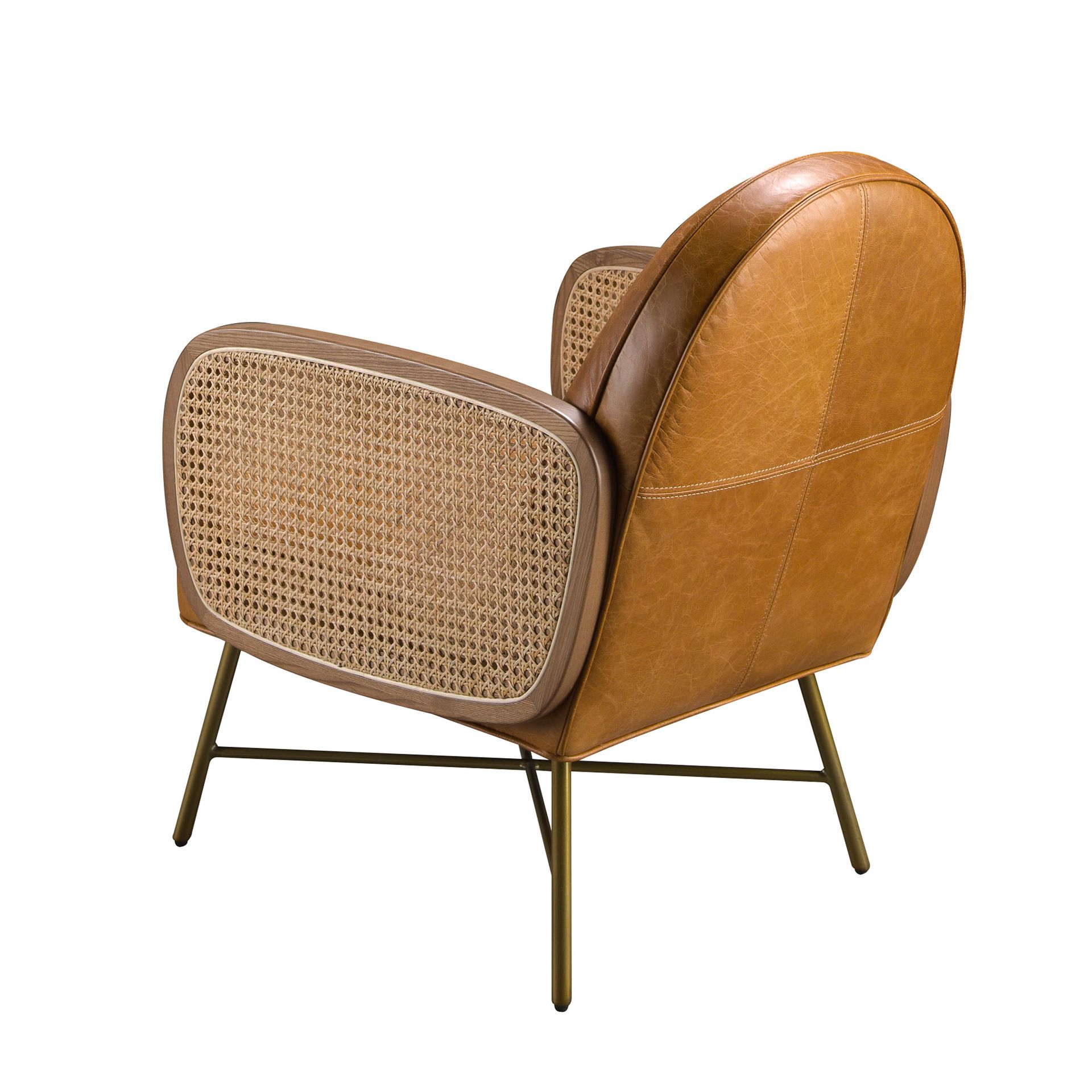 Sillón piel marrón | – Tapizado del asiento: Piel de origen vacuno de 1.25 mm de espesor- Tapizado del respaldo: Piel de origen vacuno de 1.25 mm de espesor- Composición del tapizado: 100% Piel- Material del relleno: Espuma de poliuretano de 30kg/m3 de densidad- Material de las patas: Acero inoxidable pulido en color dorado- Material del detalle: Rattán