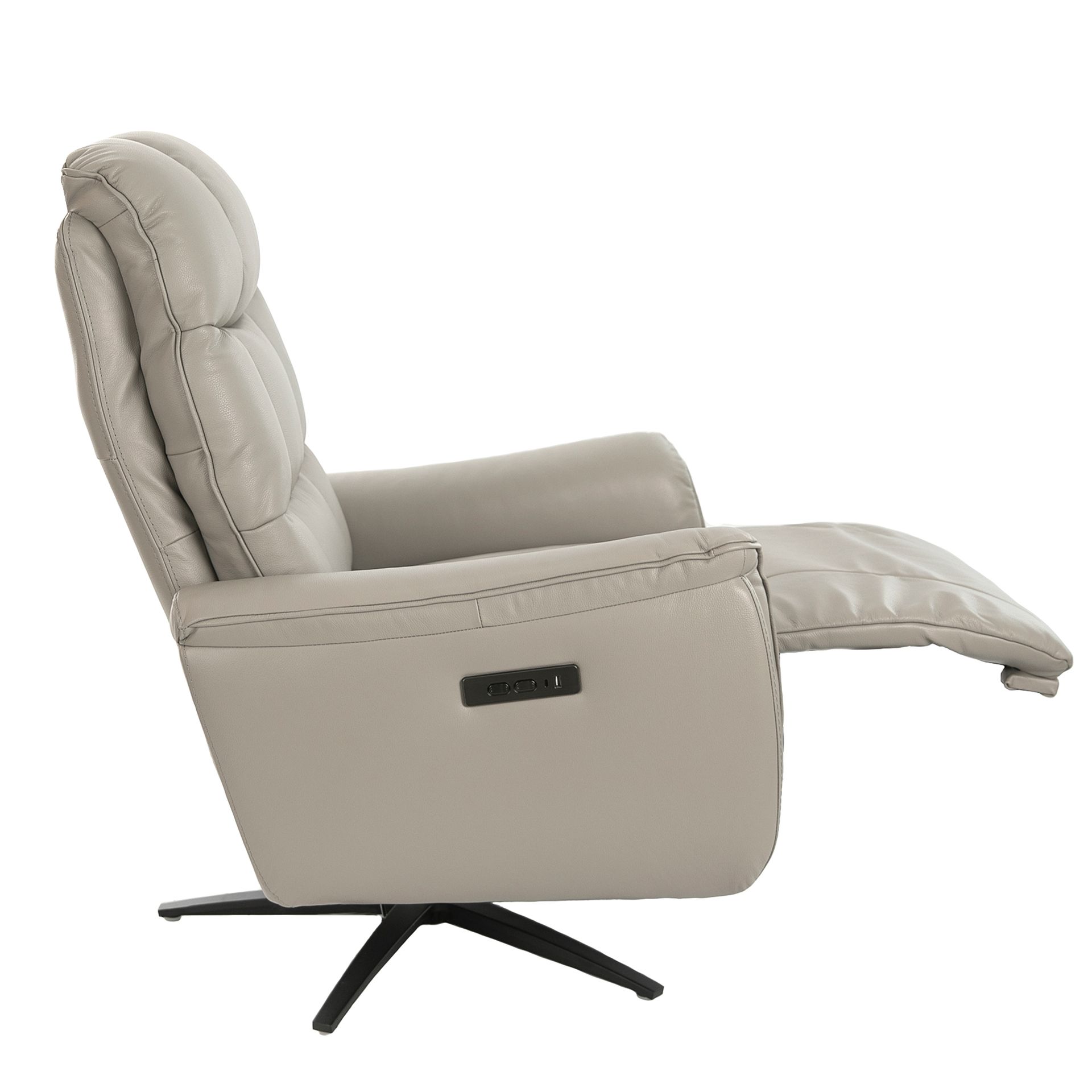 Sillón relax giratorio piel gris modelo 5114 Angel Cerdá S.L.Sillón relax giratorio con reposabrazos de diseño moderno con asiento y respaldo tapizados en piel de origen vacuno color gris. Tanto por su estilo, como por sus patas de acero inoxidable pintado en epoxi negro, este sillón relax giratorio con mecanismo relax eléctrico, es ideal para aportar el equilibrio perfecto entre estilo y comodidad.Medidas del producto: 85 x 80 x 106 cm.- El tapizado en piel de este sillón aportará elegancia y distinción, siendo además una pieza funcional a la vez que decorativa para sus estancias. – Este sillón cuenta con sistema relax, lo que le aporta el extra de comodidad que necesita para relajarse. Su accionado con dos botones eléctricos le ofrece además, una mayor practicidad y funcionalidad, pudiendo regular de forma independiente su respaldo y reposapiés. – La confección acolchada del tapizado del asiento y el respaldo, así como su relleno en espuma de poliuretano de 25kg/m3, le permitirá contar con el máximo confort. – Cuidando hasta el más mínimo detalle, sus puertos USB y USB-C le permitirá tener cerca sus dispositivos, garantizando la combinación perfecta entre diseño y versatilidad.