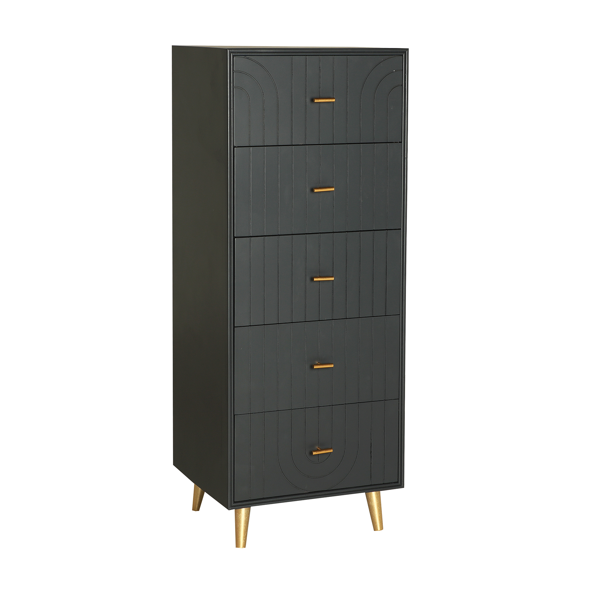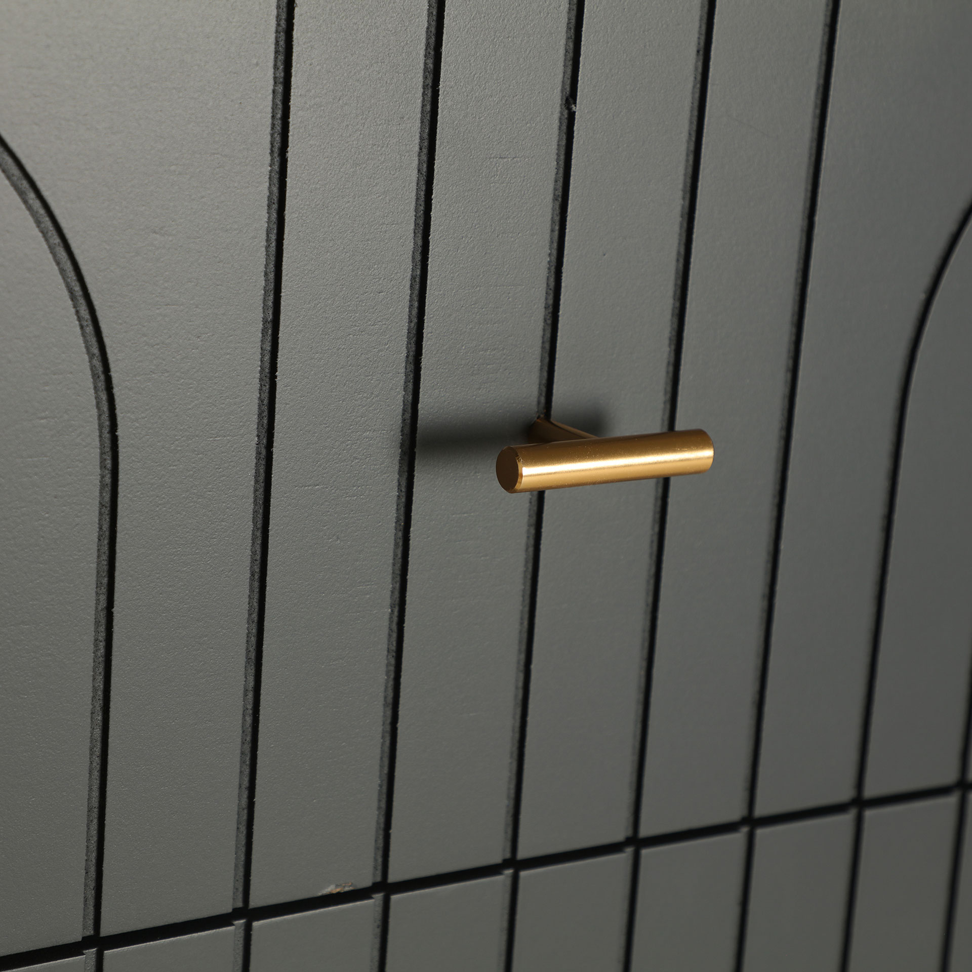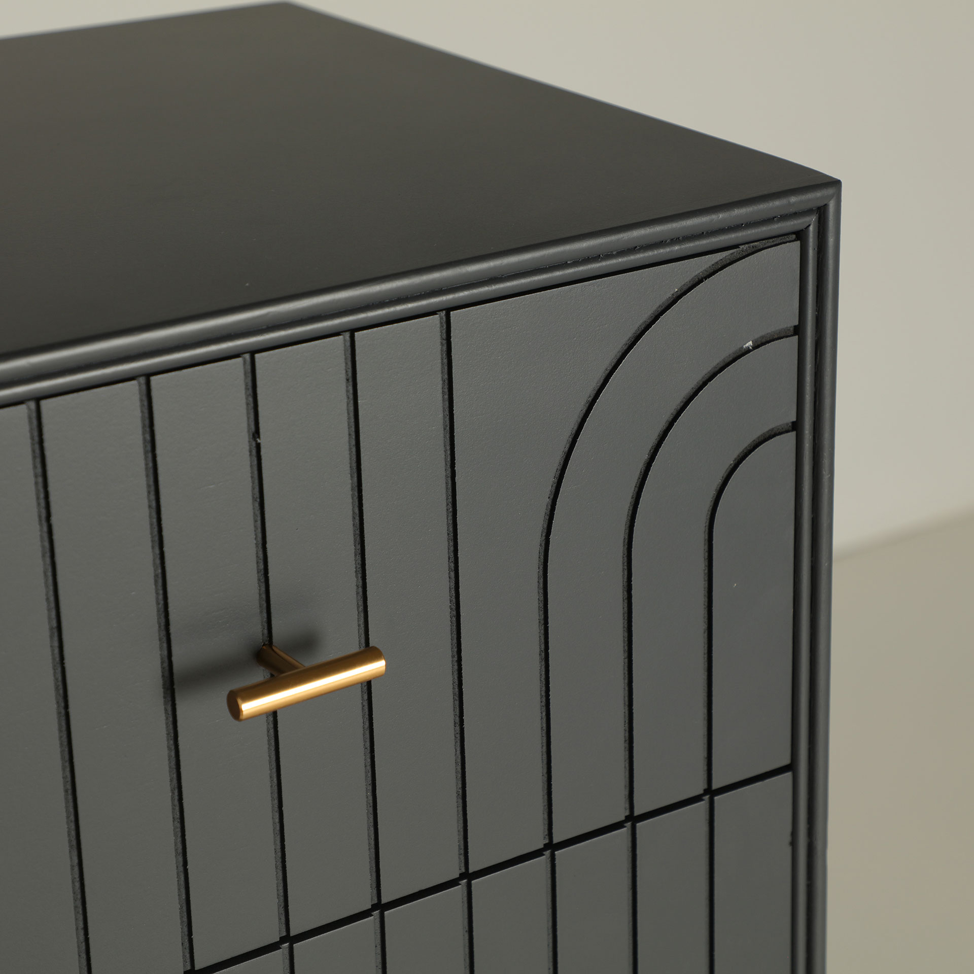 Sinfonier rectangular tremes de estilo art deco, fabricado en madera dm en color gris con acabado oscuro, combinado con hierro en color oro con acabado brillo.
