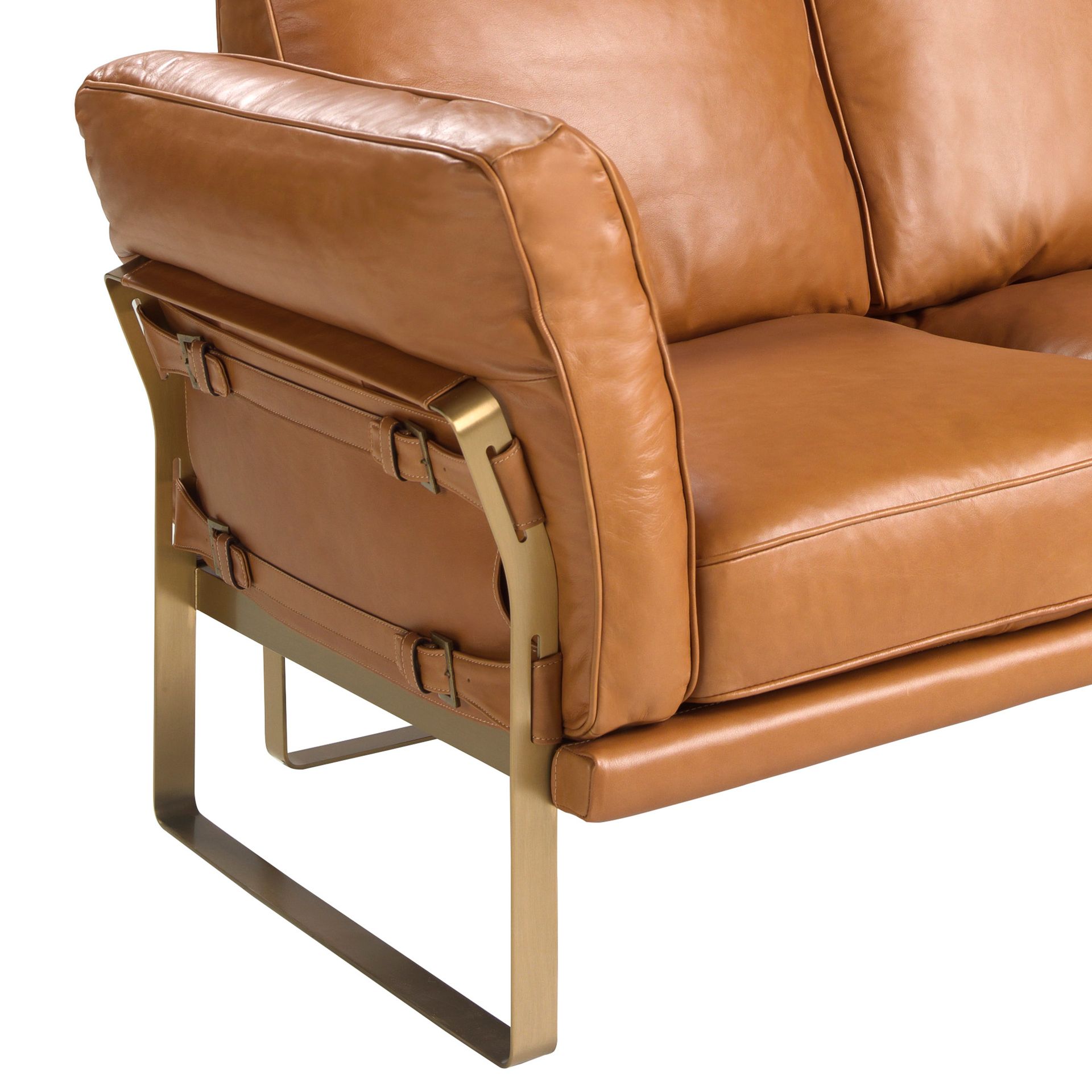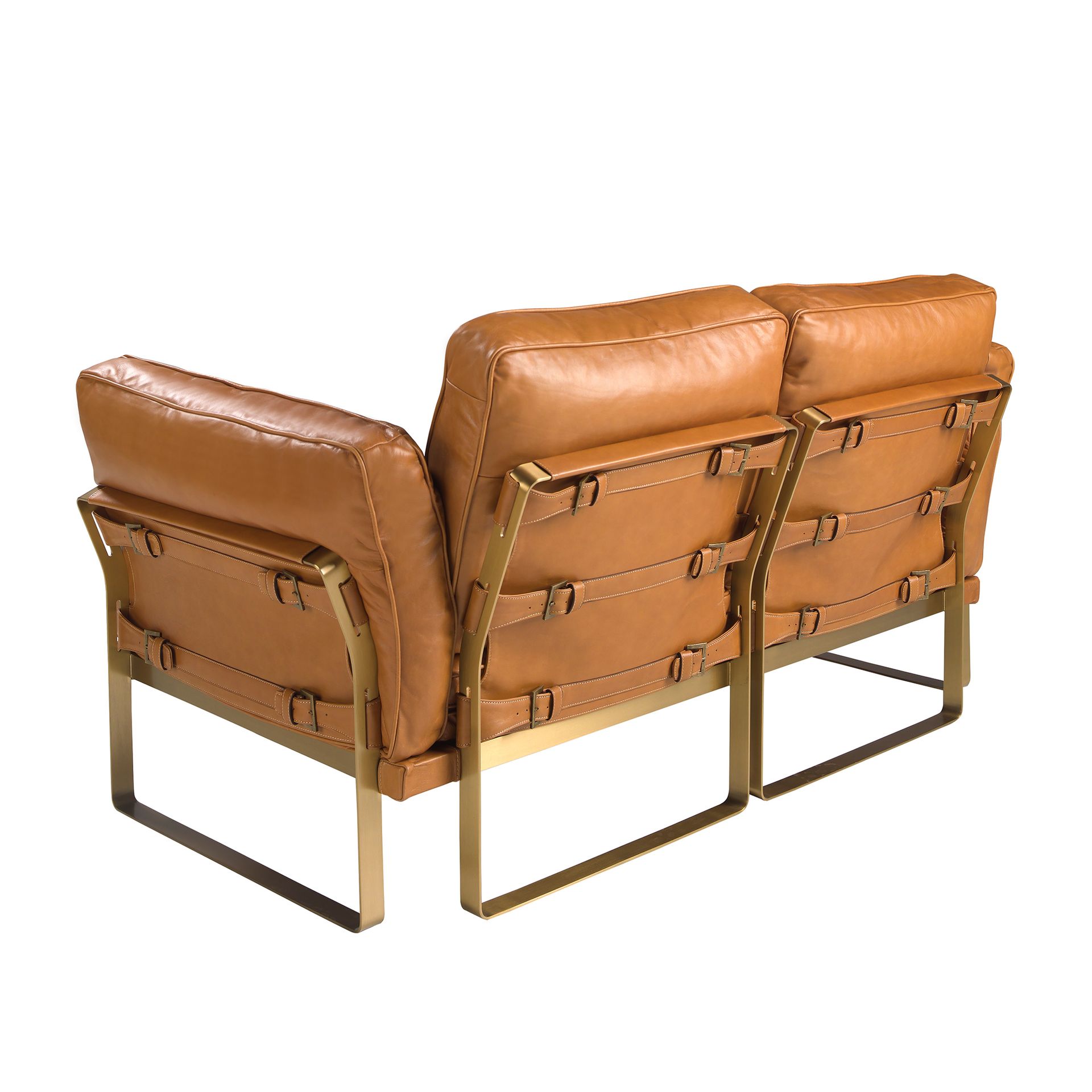 Sofá 2 plazas piel camel | – Material del tapizado: Piel de origen vacuno de 1.25 mm de espesor- Composición del tapizado: 100% Piel- Material del relleno: Espuma de poliuretano de 25kg/m3 de densidad- Material de las patas: Acero inoxidable en color dorado- Material de la estructura interna: Madera maciza de pino natural