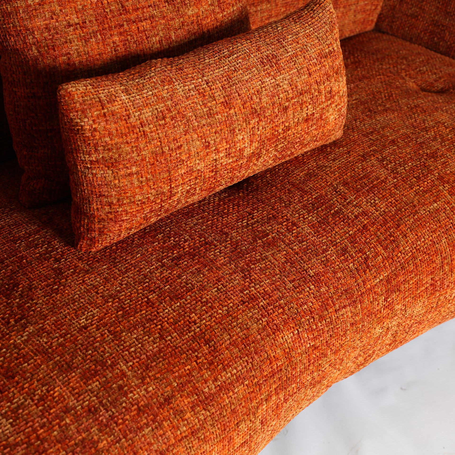 Sofá rectangular lungern de estilo art deco, fabricado en poliéster en color naranja, combinado con latón en color oro y madera eucalipto.