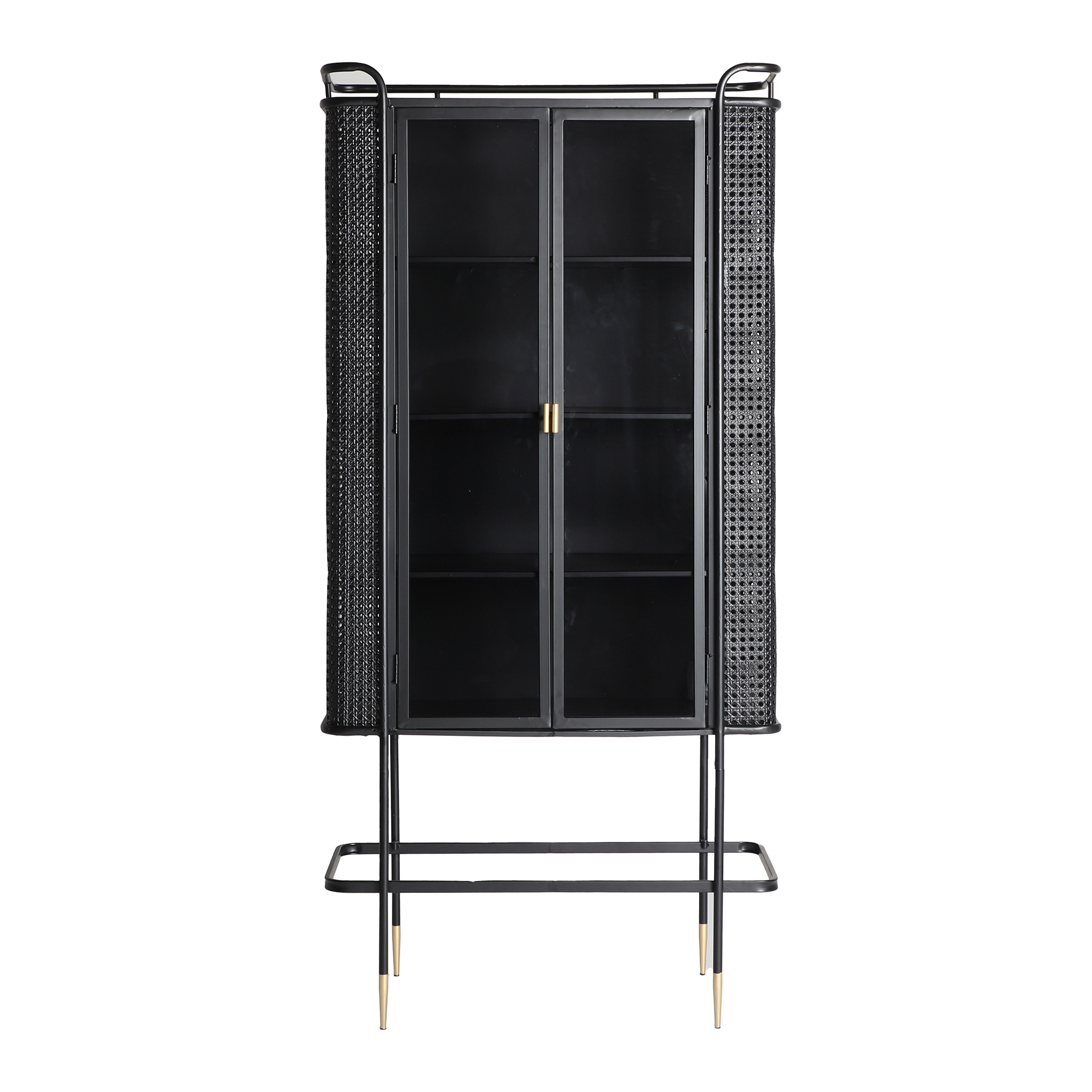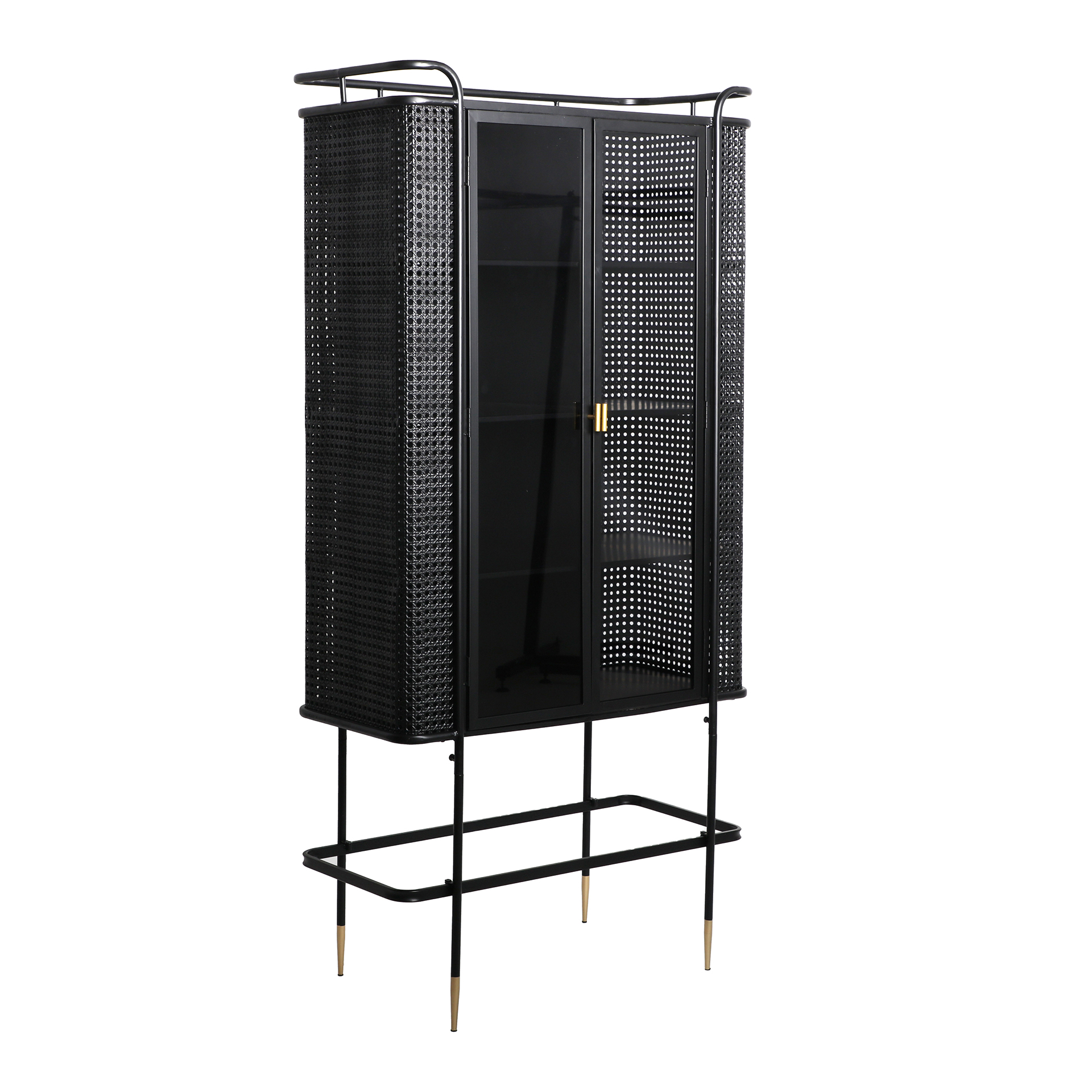 Vitrina Fussen de estilo industrial, fabricado en hierro en color negro, combinado con vidrio en color oro. Producto desmontable.