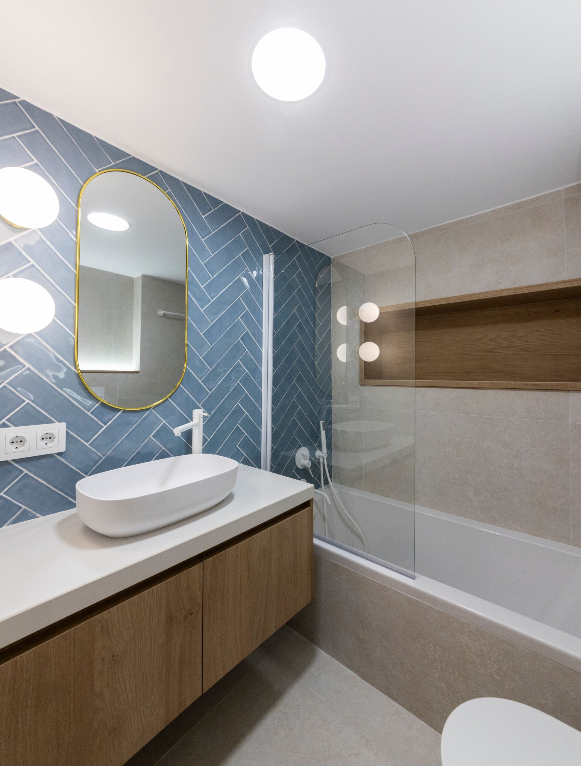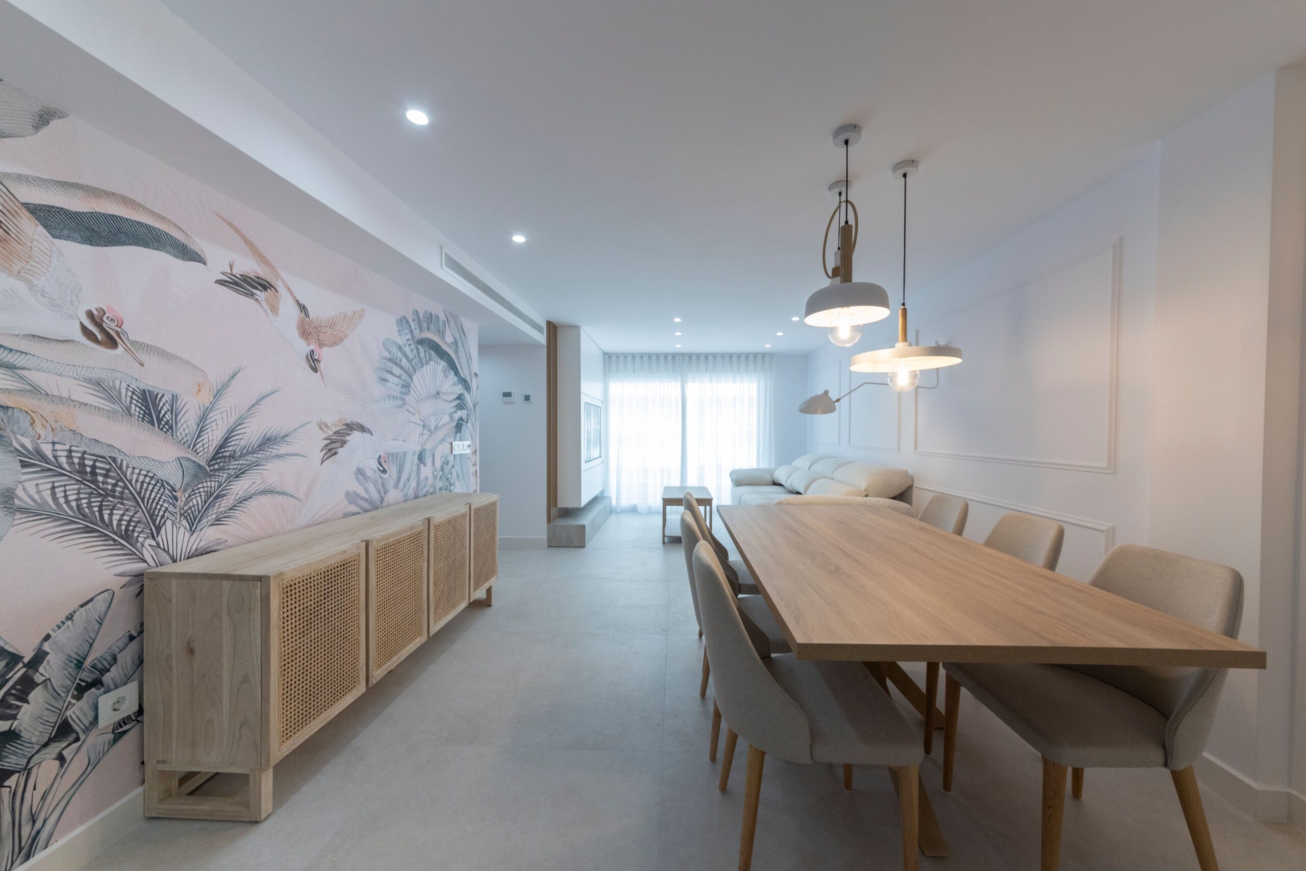 Este proyecto de interiorismo fusiona diseño moderno y confort en cada rincón de la vivienda. En el salón, se ha utilizado una paleta neutra con acabados en blanco y madera que aportan luminosidad y calidez al espacio. La pared con el mural de hojas y aves introduce un toque natural y fresco, mientras que los muebles de líneas sencillas y elegantes, como el sofá y la mesa de madera, invitan a la relajación y disfrute del hogar.