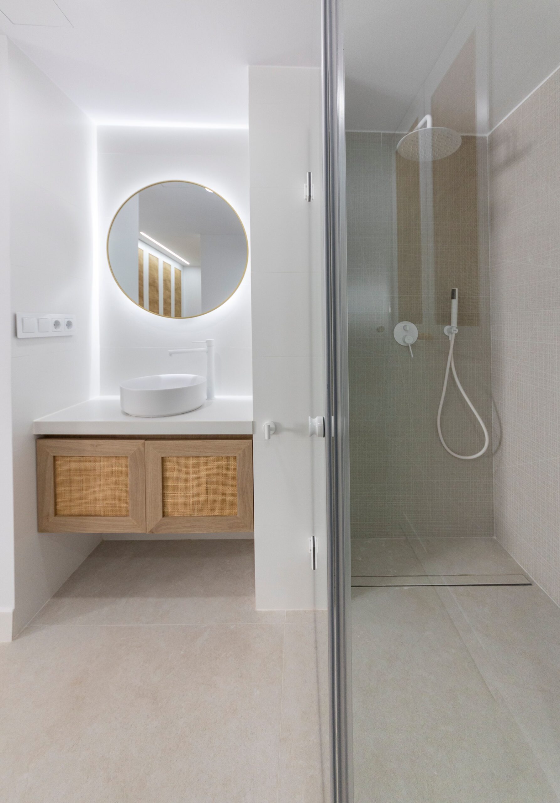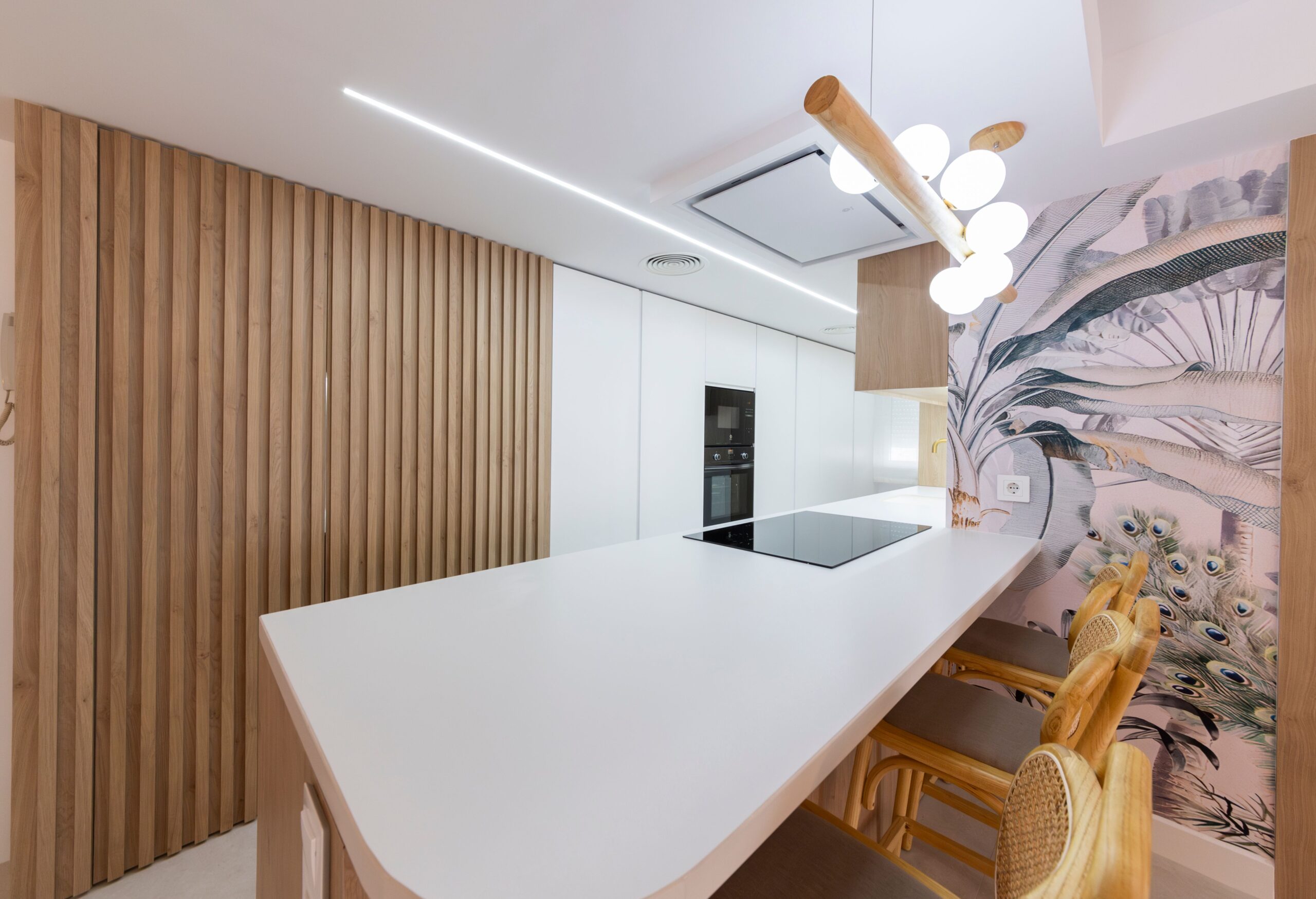 La cocina destaca por su estilo minimalista, donde el blanco predominante se combina con detalles en madera natural que aportan textura y carácter. La isla central con taburetes de ratán crea un ambiente funcional y acogedor, ideal para reuniones informales o cenas familiares. Los acabados en materiales como el mármol y los electrodomésticos integrados aseguran una experiencia visual impecable y una excelente funcionalidad.