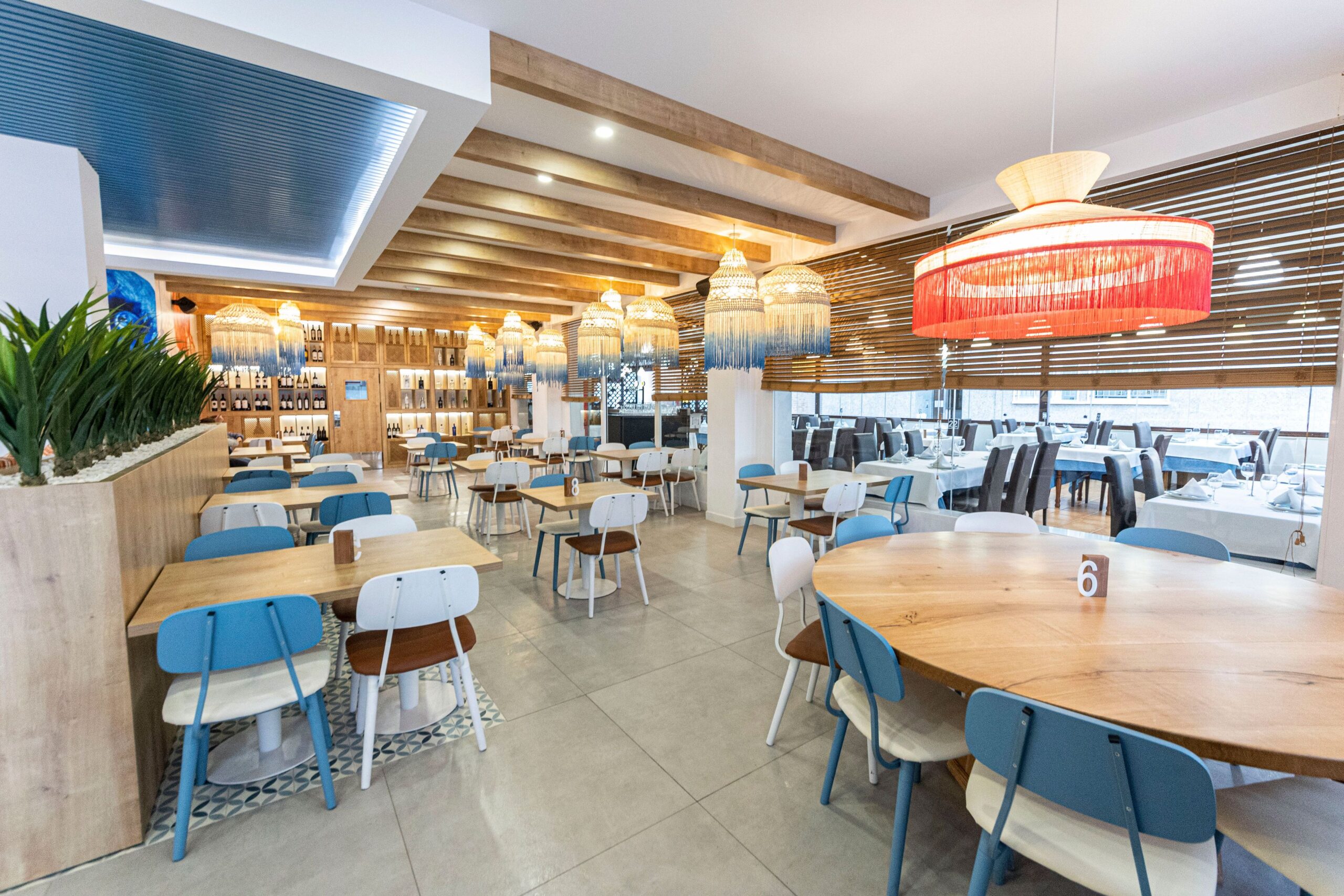 Las lámparas de diseño que decoran el techo, con un estilo artesanal en tonos azules degradados, añaden un aire cálido y relajante al ambiente. Los colores neutros, los tonos de madera natural y los detalles en azul y blanco refuerzan la frescura del espacio, evocando la serenidad del mar y su entorno.