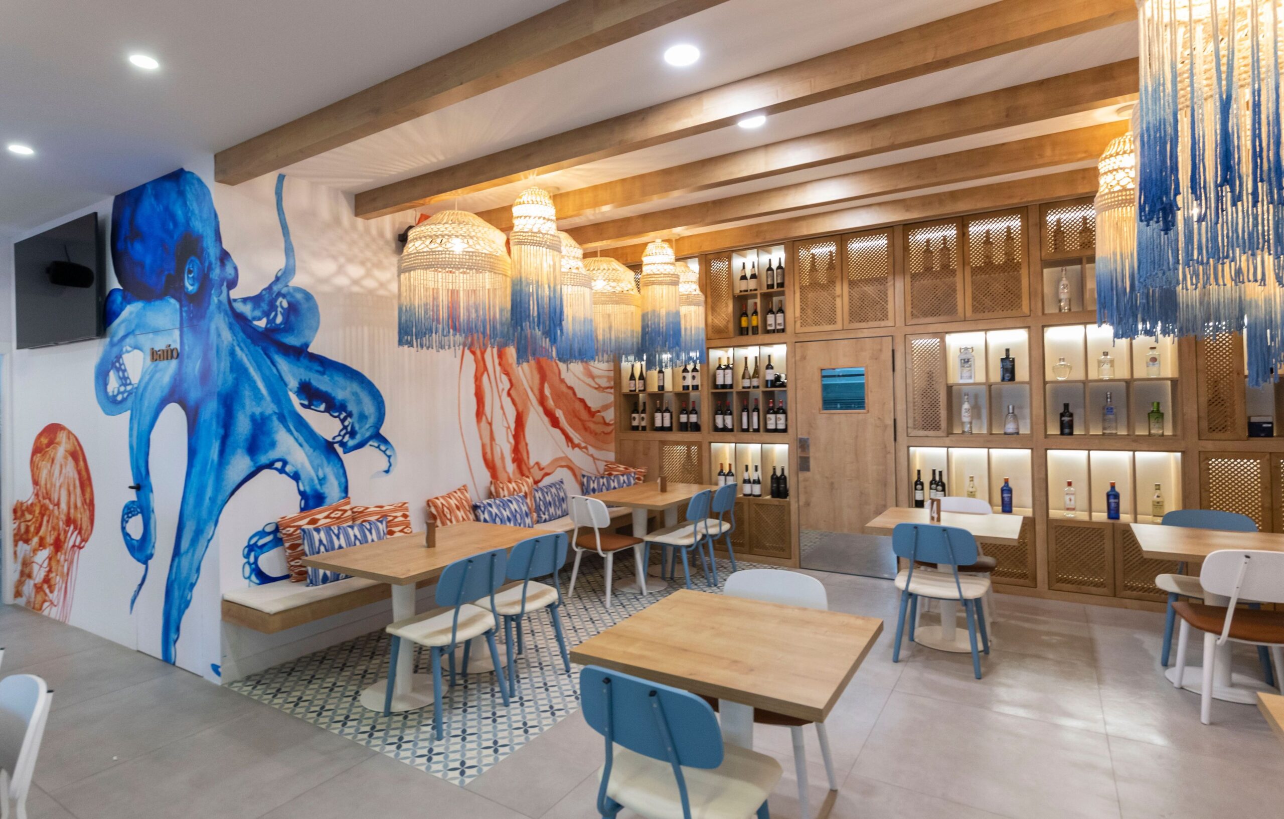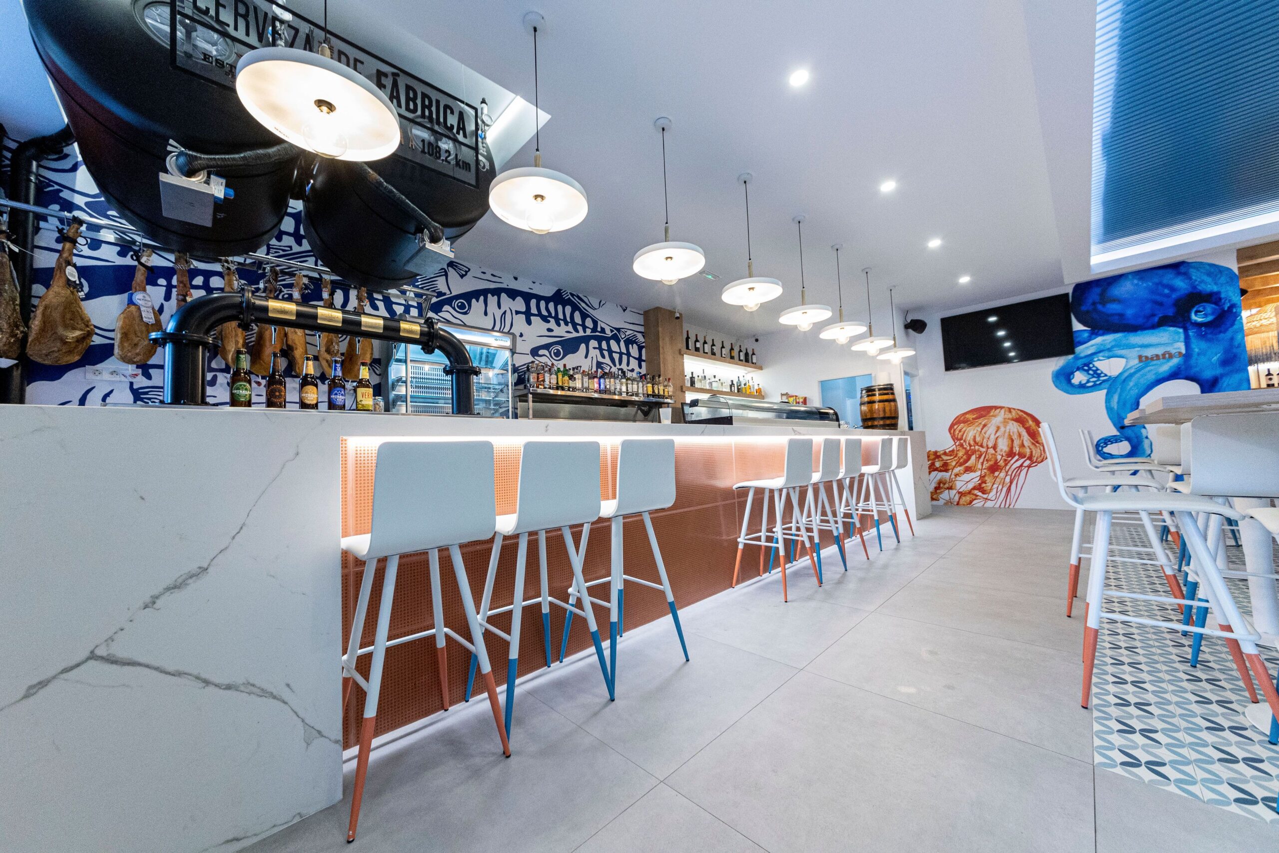 La zona de la barra, con su diseño funcional y elegante, invita a disfrutar de un buen trago mientras se admira el mural de inspiración marina que adorna la pared. La selección de materiales, como el cobre y el mármol, junto con las lámparas de estilo minimalista, brindan un contraste contemporáneo que completa el estilo único del restaurante.