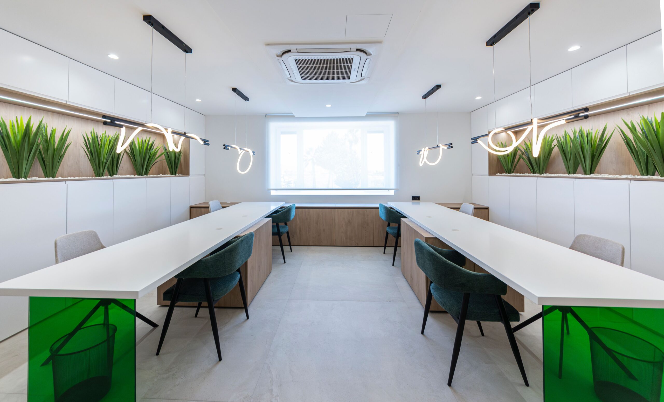 La zona de recepción destaca por una pared decorativa con iluminación que resalta el nombre de la empresa, creando una primera impresión cálida y profesional. Los acabados en madera, junto con el uso de verdes vibrantes en los muebles y plantas, aportan una sensación de frescura. El uso de materiales de alta calidad asegura tanto la estética como la durabilidad del espacio, creando una atmósfera acogedora y eficiente.
