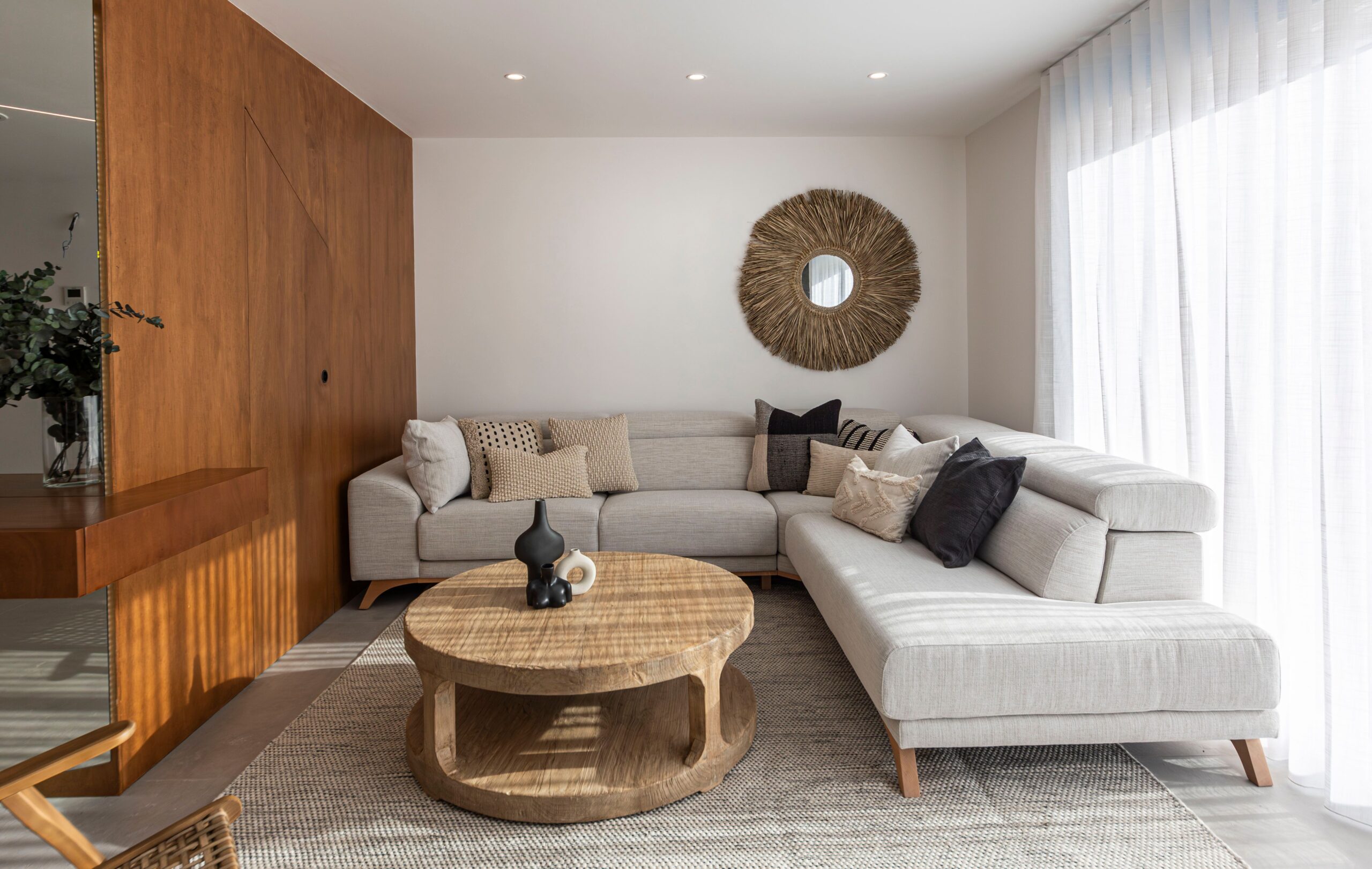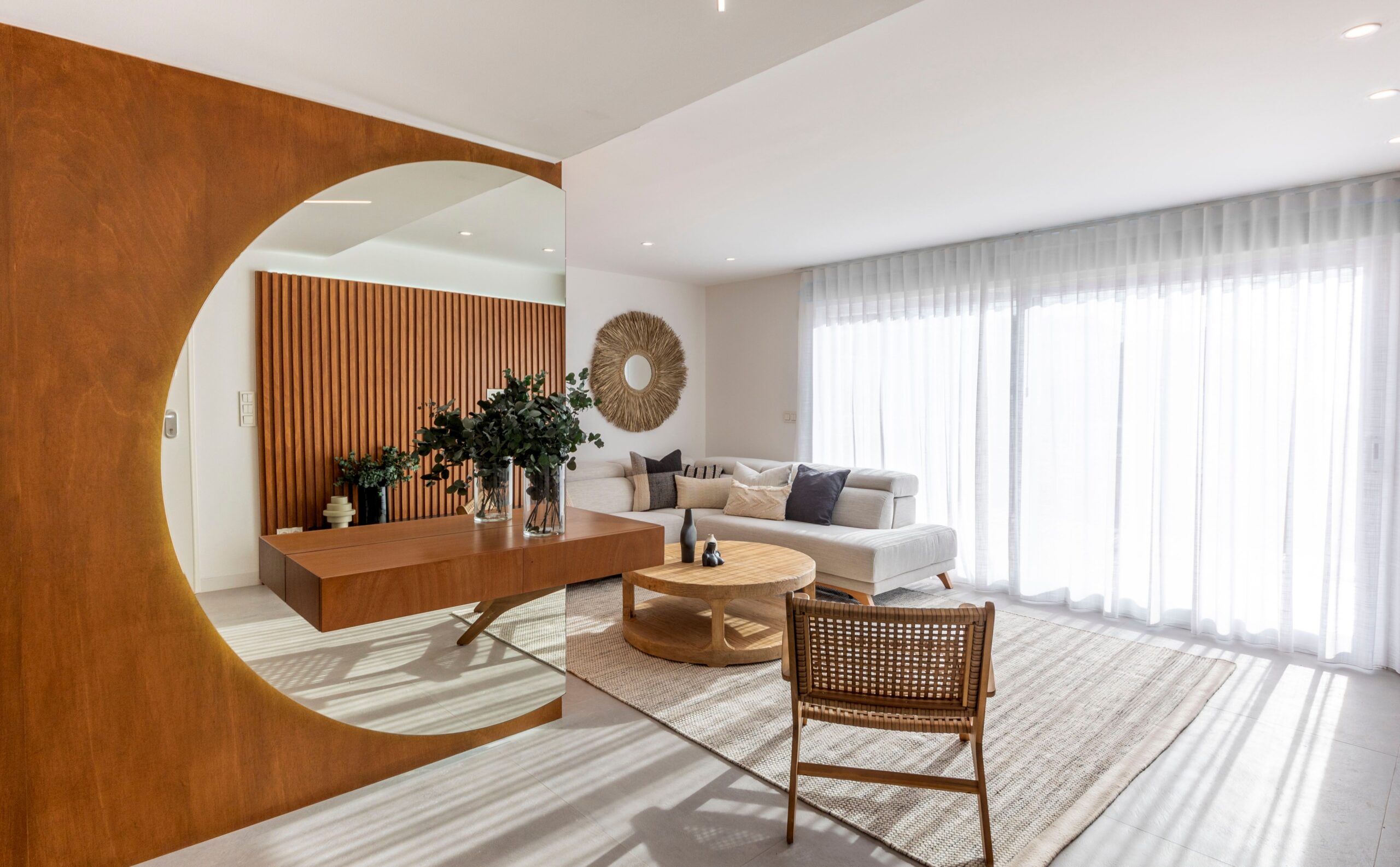 La zona de estar y la cocina abierta se fusionan de forma fluida siguiendo el forrado de madera de la pared que oculta las entrada y accesos a la vivienda, manteniendo una estética limpia y funcional. Elementos como las tiras led sobre la isla o el espejo de medio circulo son los que dan carácter y personalidad al proyecto, este espejo nos ayuda a refleja la luz y el salón dando amplitud y sirviendo a su vez como mueble de entrada.