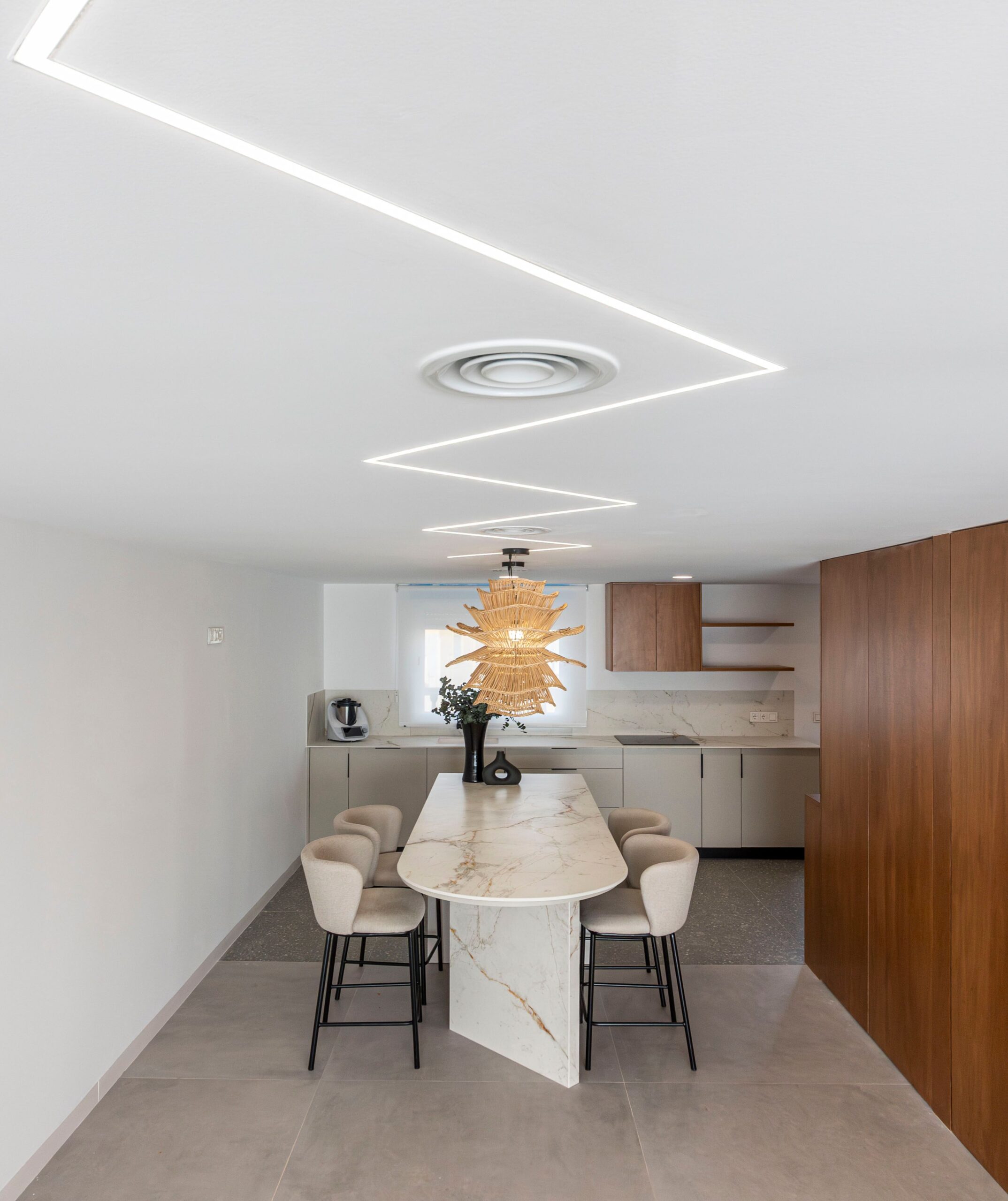 Este proyecto de interiorismo refleja un enfoque contemporáneo y cálido, donde cada detalle ha sido pensado para proporcionar una experiencia de confort visual y físico. Los amplios espacios combinan materiales, destacando la calidez de la madera en tonos cálidos que se integra perfectamente con las superficies de mármol y los acabados en tonos neutros.