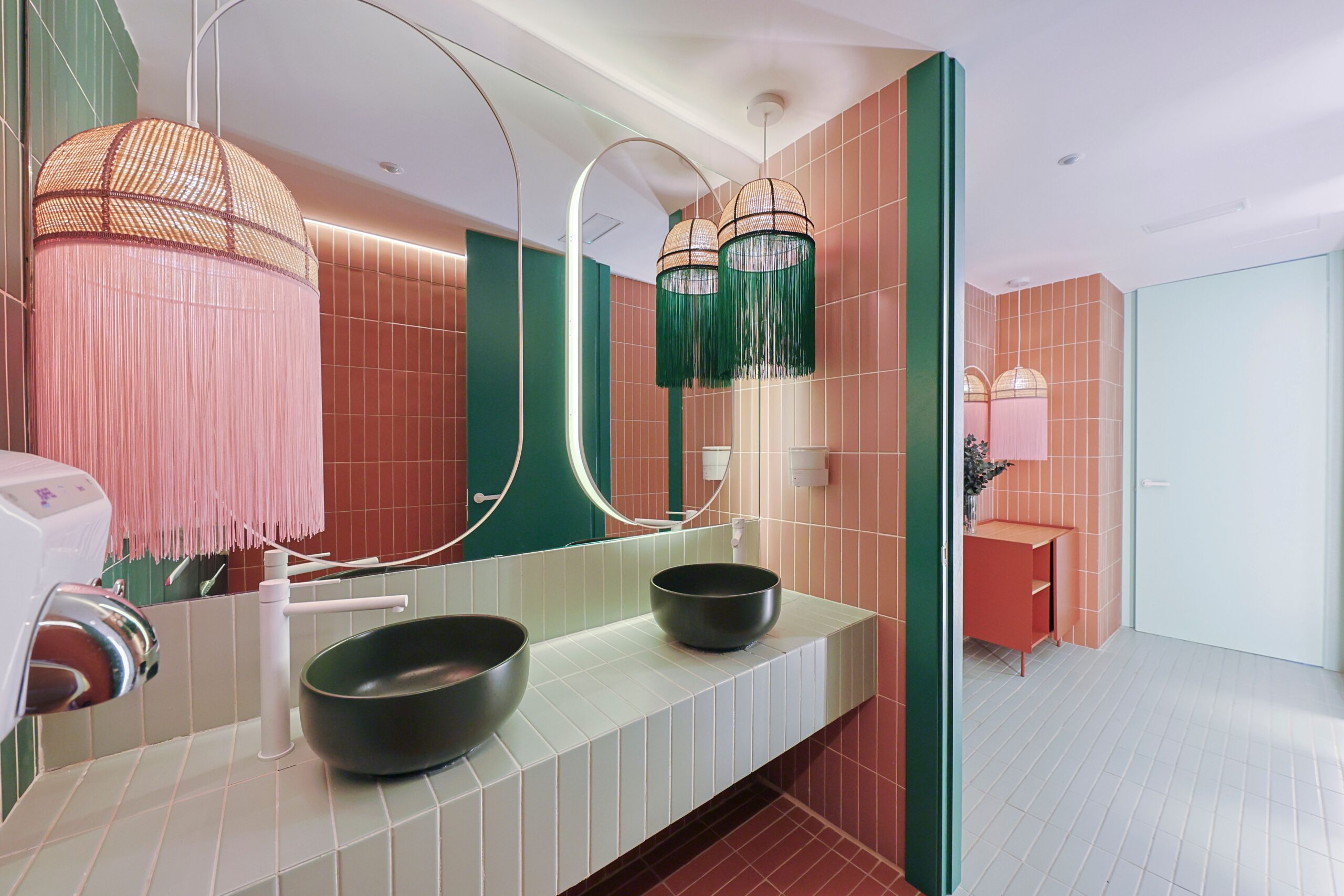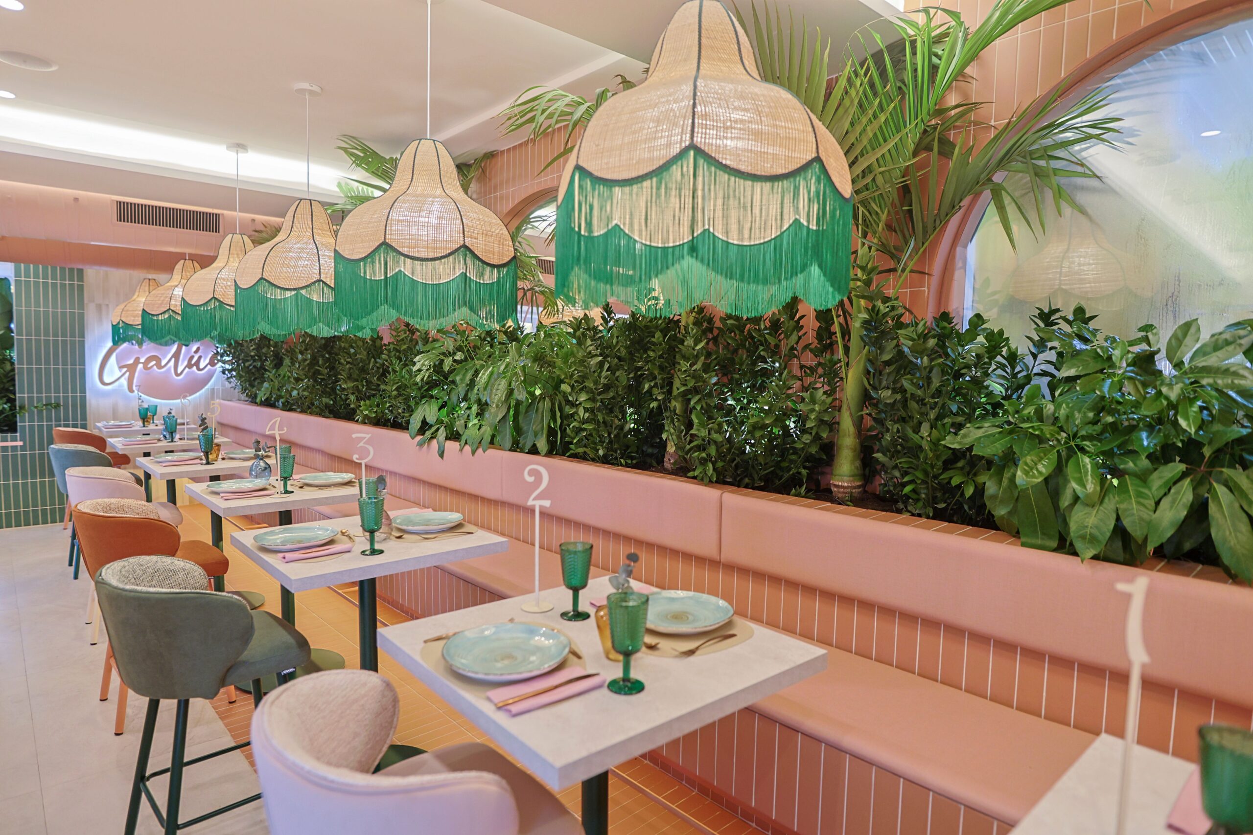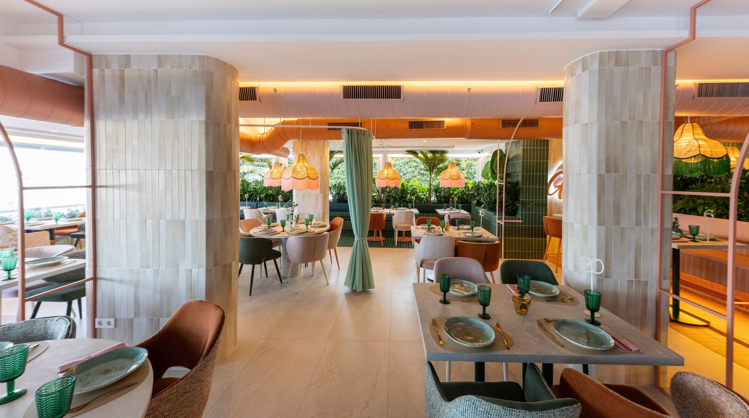 Este proyecto de interiorismo para restaurante se articula a partir de una paleta cálida y natural, donde los tonos verdes, terracota y rosados dialogan con revestimientos cerámicos y superficies continuas y vegetación. La organización del espacio mediante cortinas móviles busca claridad y fluidez, combinando zonas abiertas con rincones más recogidos que favorecen una experiencia cómoda y relajada.