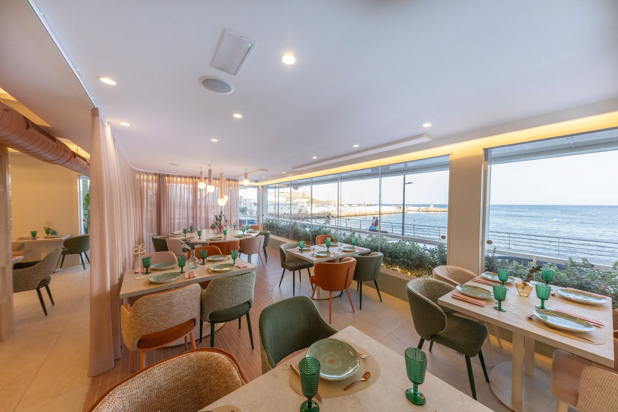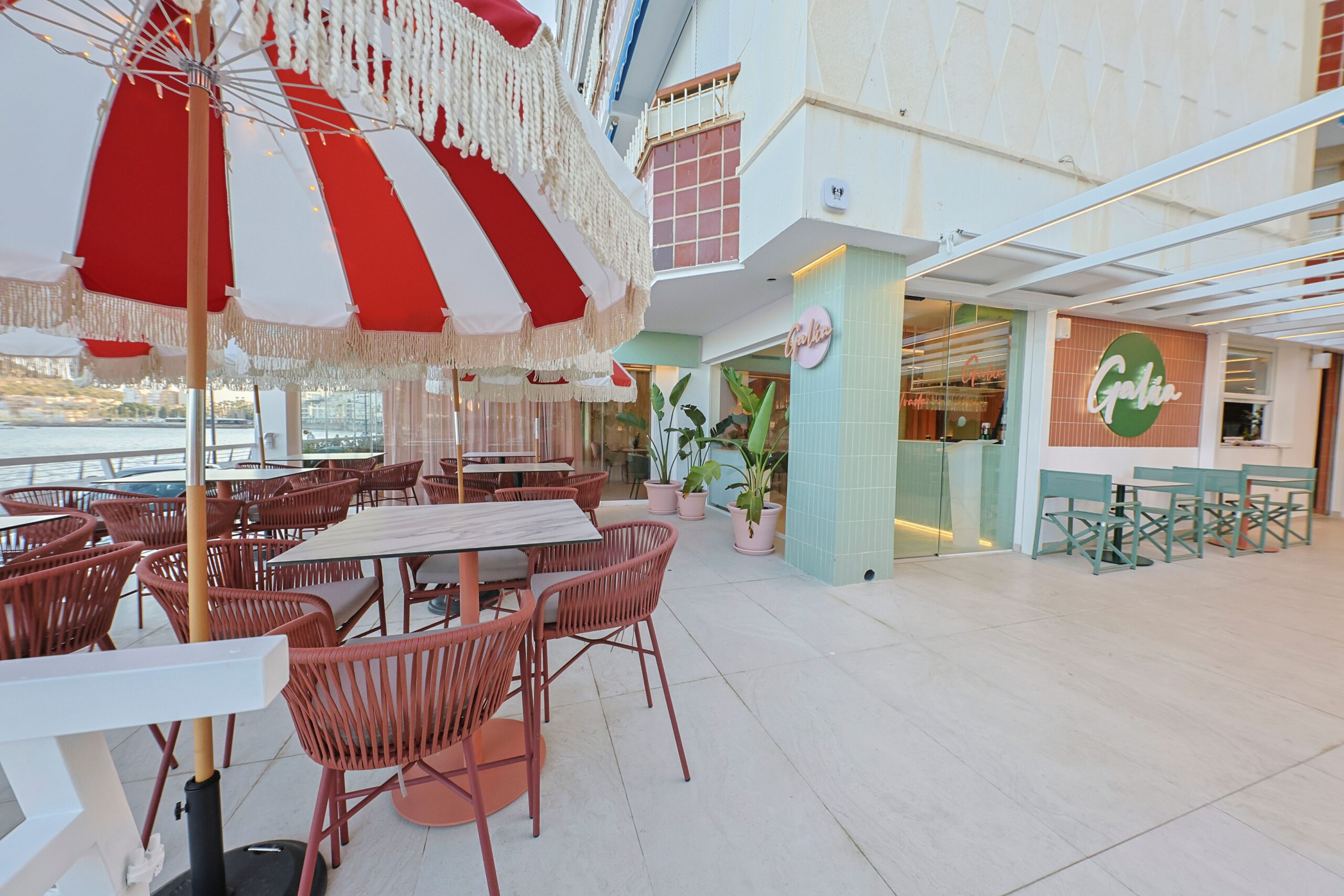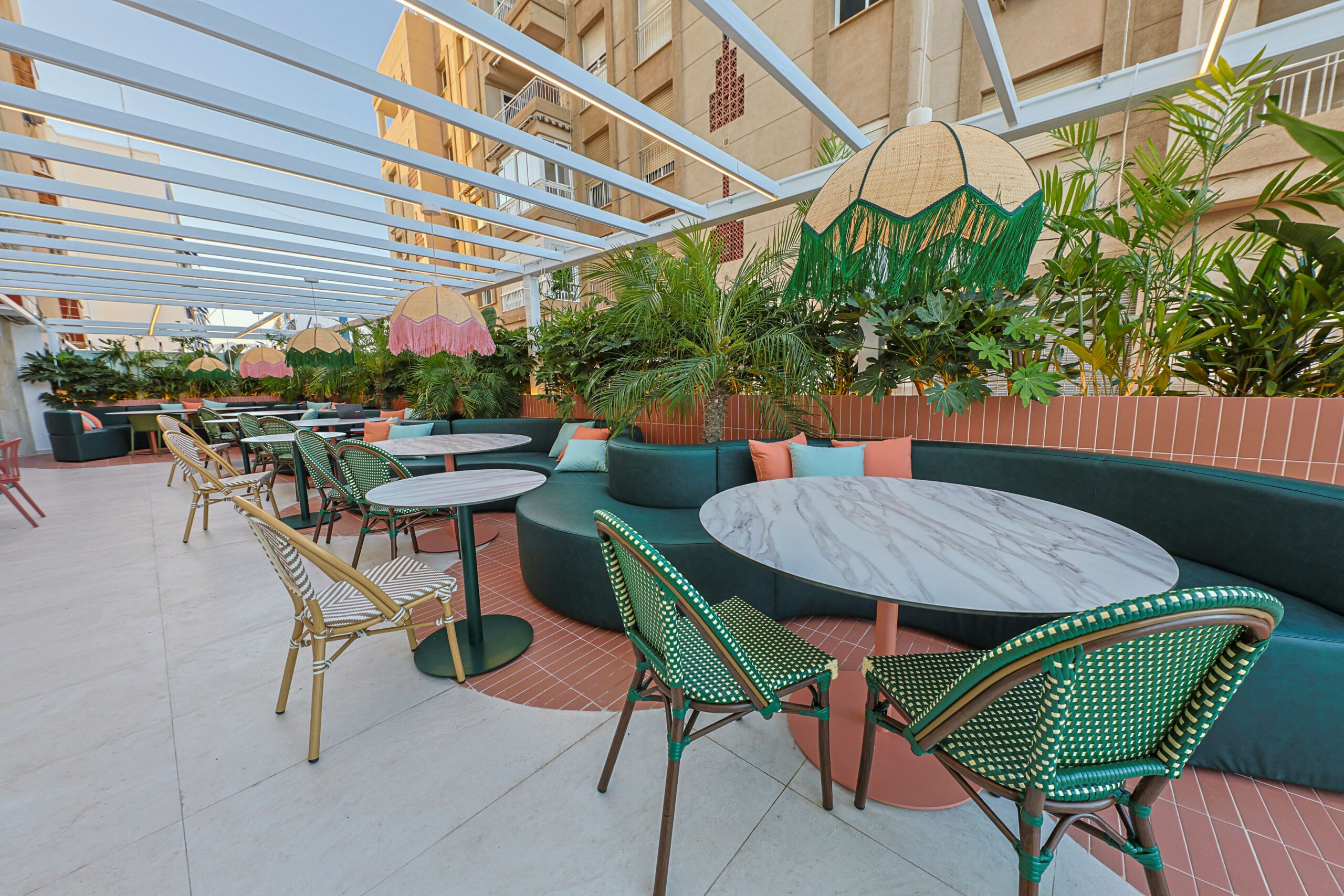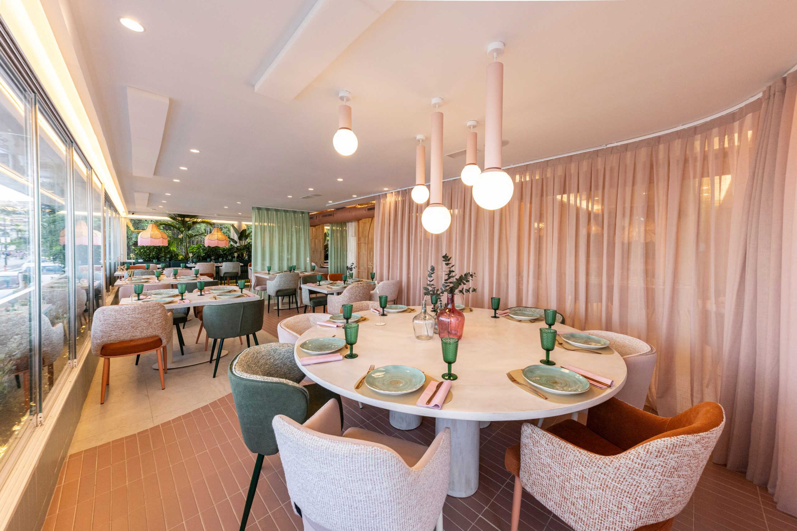 La terraza amplía el interior hacia el exterior mediante la barra creando una atmósfera fresca y vegetal. Sombrillas retro respetando la paleta de colores, bancos curvos, mesas redondas y sillas de inspiración clásica se integran entre jardineras generosas, creando un entorno agradable y dinámico, protegido por una estructura ligera que tamiza la luz natural.