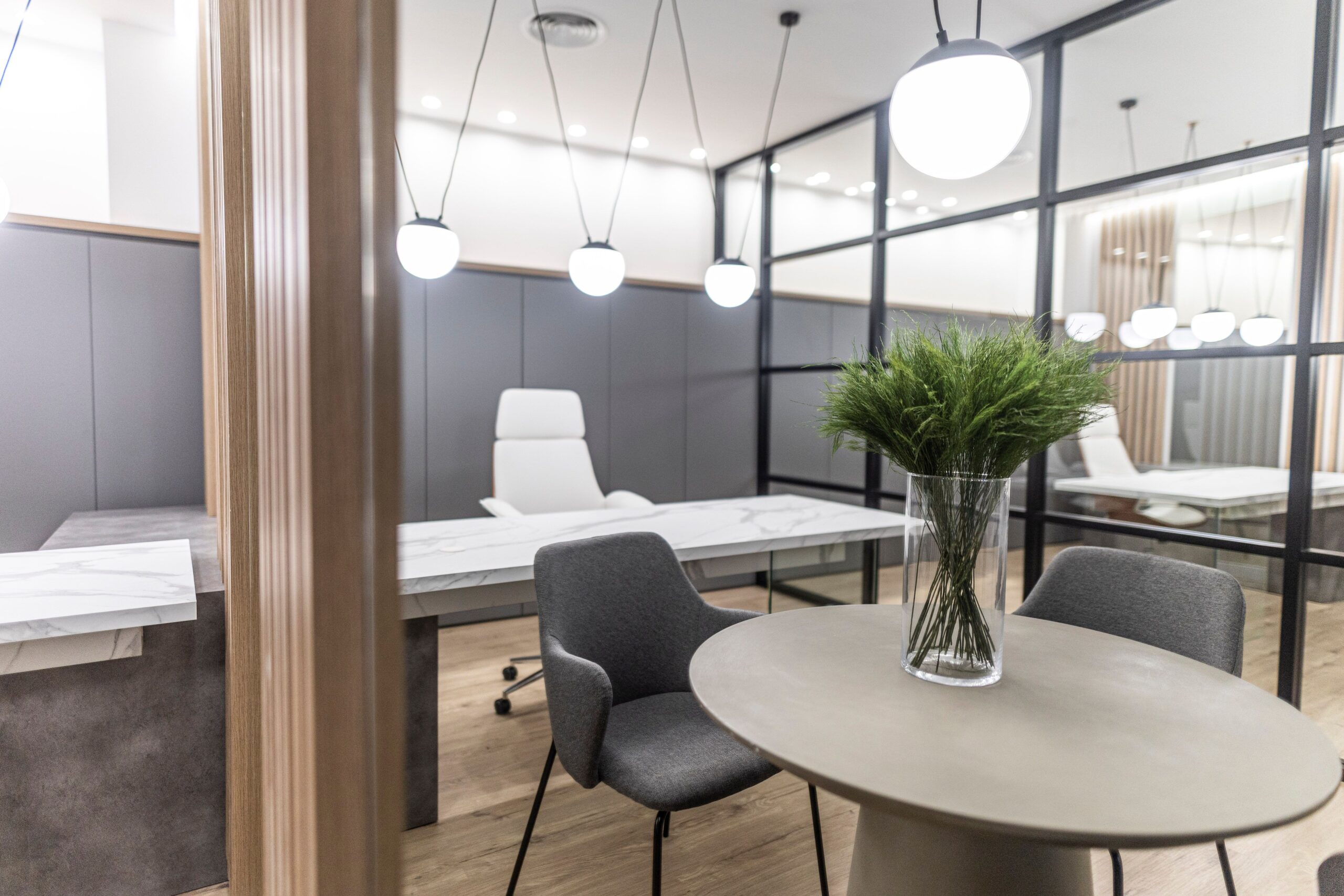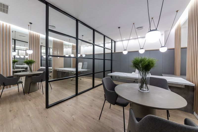 Las divisiones internas están cuidadosamente planteadas, con paneles de vidrio que permiten una conexión visual entre los distintos espacios sin perder la privacidad. La sala de reuniones, con mesas circulares y sillas cómodas, crea un ambiente ideal para el intercambio de ideas, mientras que las plantas en puntos estratégicos aportan frescura y un toque natural que humaniza el espacio.