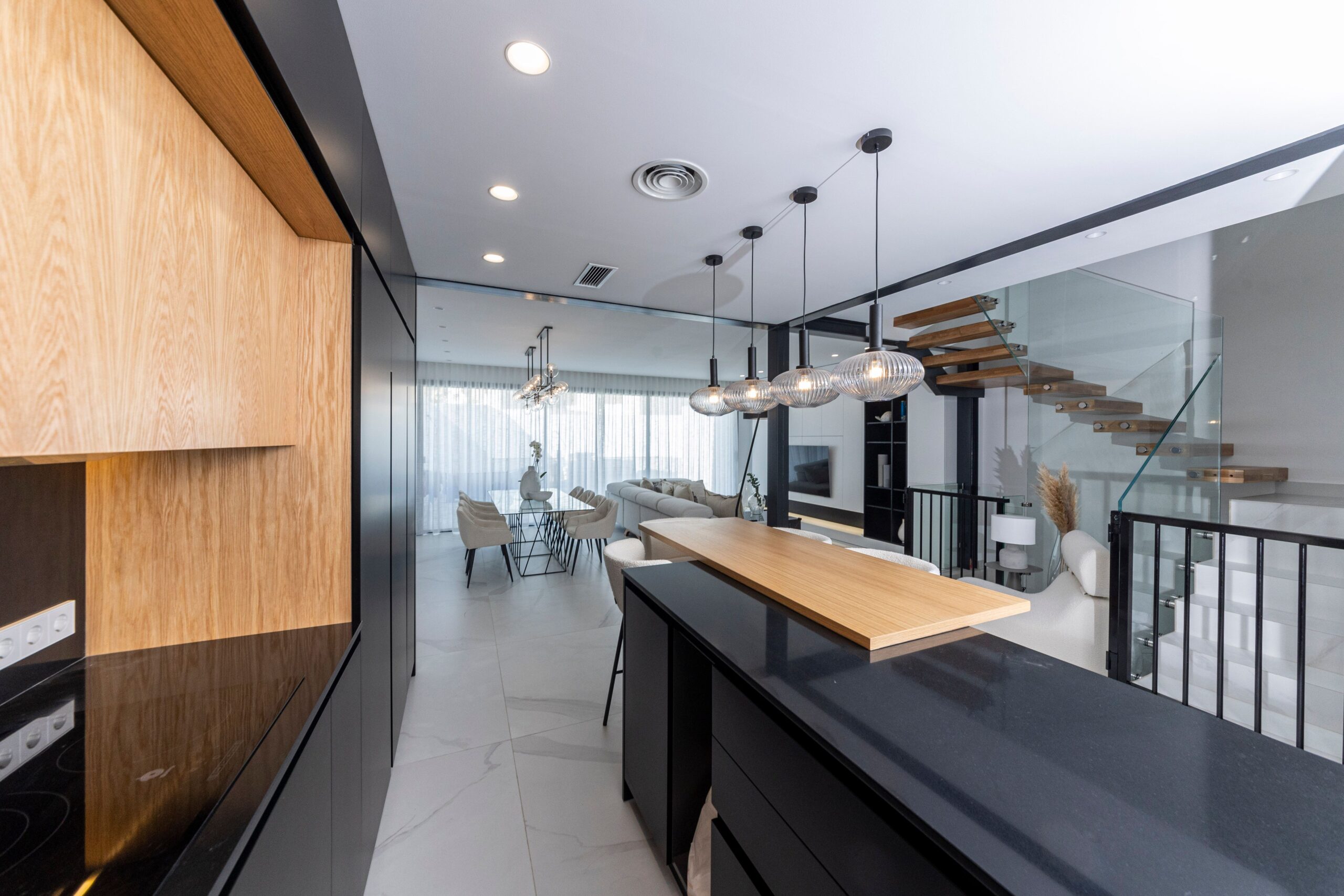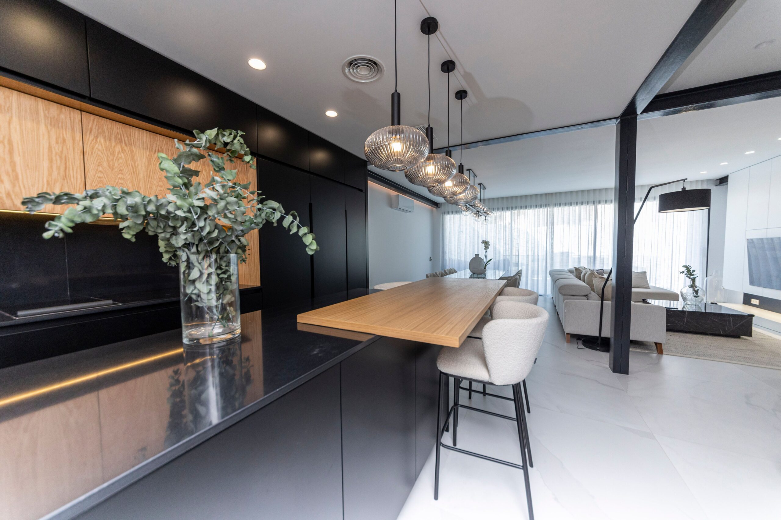 Este proyecto de interiorismo destaca por su elegancia contemporánea con la integración de materiales y colores. La cocina, en madera natural y tonos oscuros, se conecta de manera fluida con el salón a través de una isla que también funciona como zona de desayuno. La luz, que inunda el espacio a través de los grandes ventanales, resalta los detalles de los muebles, mientras que las lámparas de diseño moderno sobre la mesa del comedor aportan un toque de sofisticación y estilo.