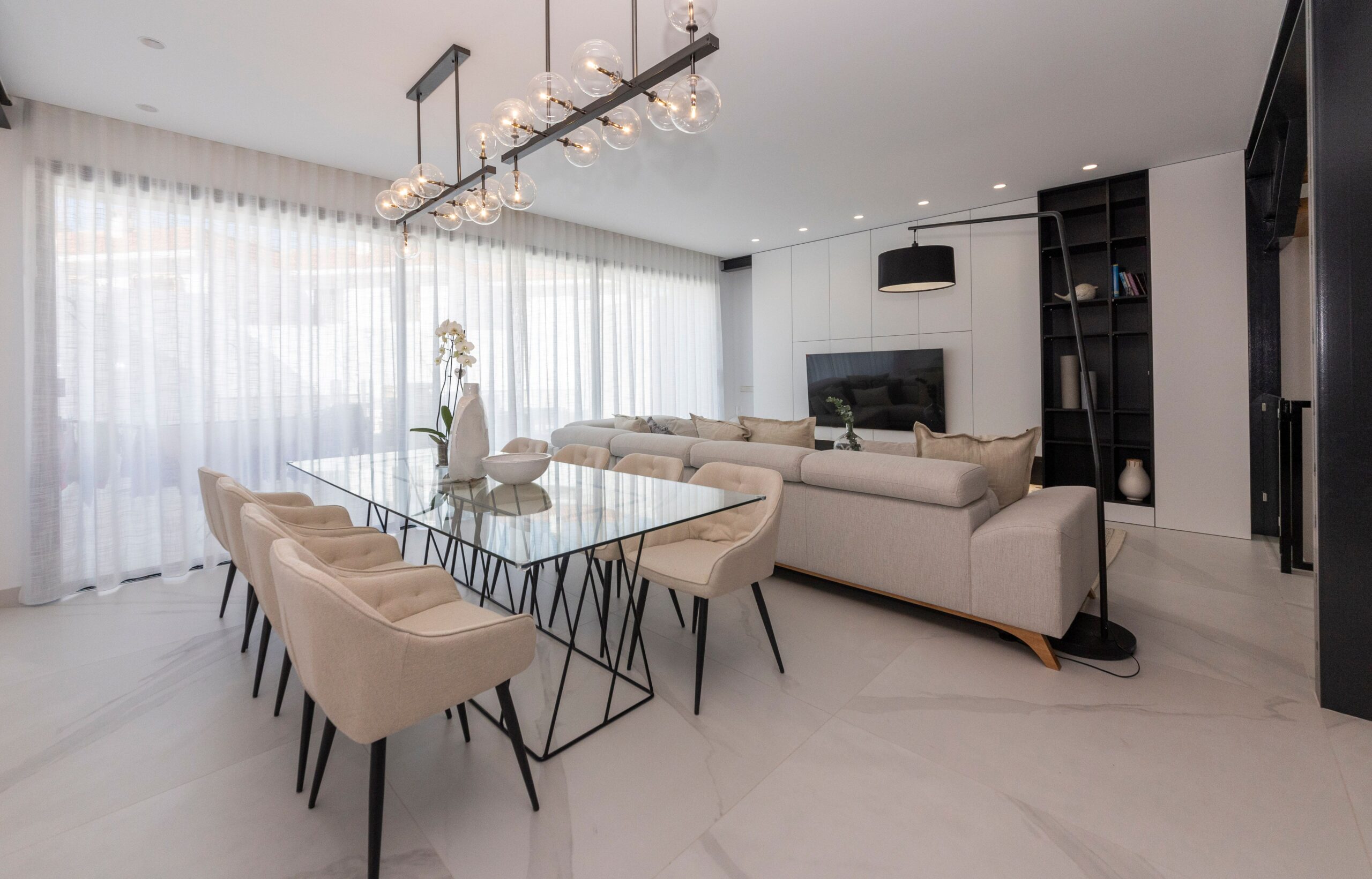El salón, de líneas simples, se caracteriza por sus sofás en tonos neutros y sus mesas de centro en materiales como el mármol y la madera. La distribución abierta y espaciosa fomenta la comodidad y la interacción, creando un ambiente perfecto para el día a día. La estantería minimalista que se extiende hasta el techo complementa el diseño moderno, a la vez que ofrece espacio de almacenamiento.