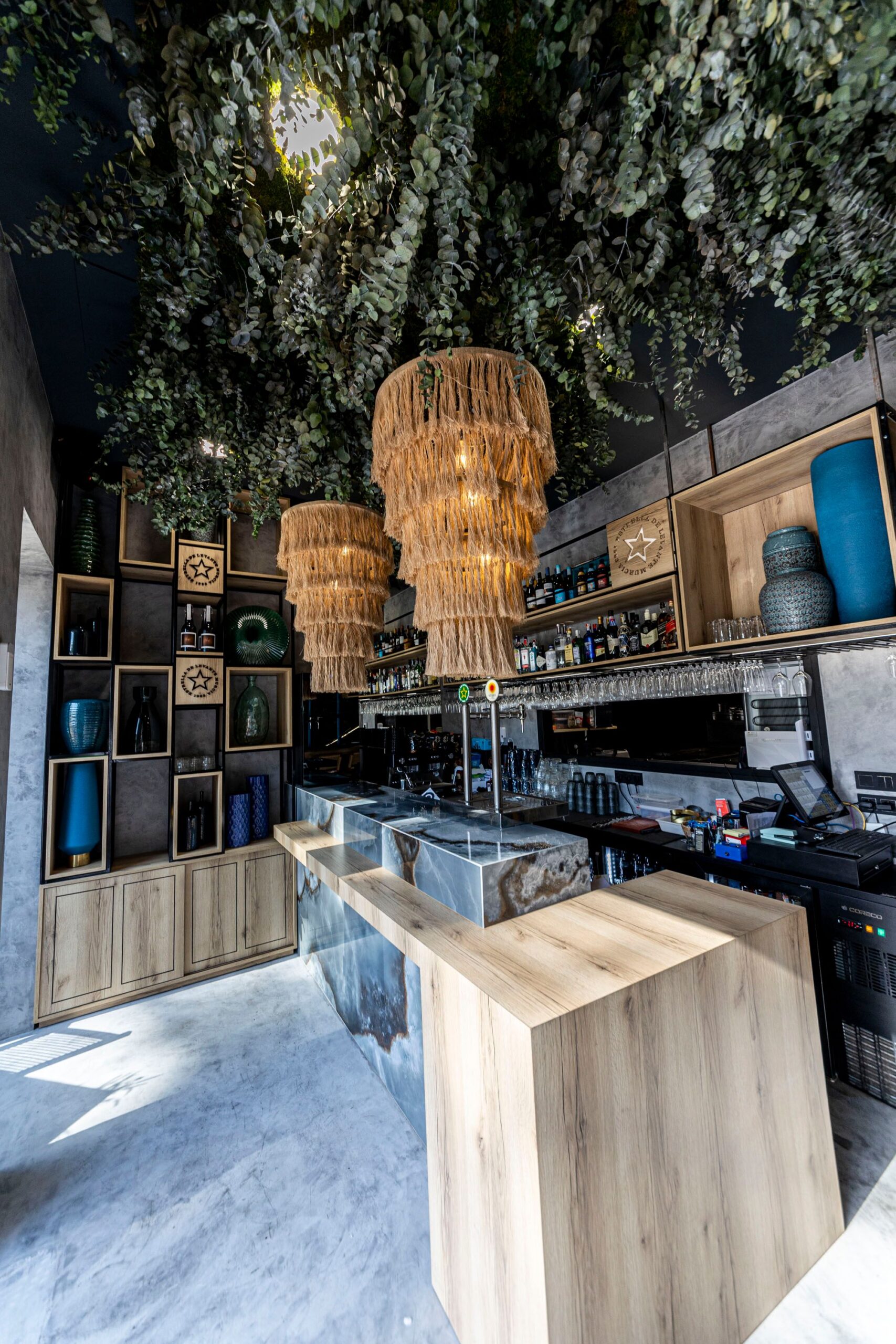 El interior del restaurante sigue esta misma línea, destacándose por el uso de materiales naturales como la madera y el mármol, junto con un diseño contemporáneo que proporciona una sensación de calidez y sofisticación. El bar, de líneas limpias y modernas, es el centro de atención, con una decoración que combina tonos neutros y detalles cuidadosamente seleccionados que invitan a la relajación y el disfrute.