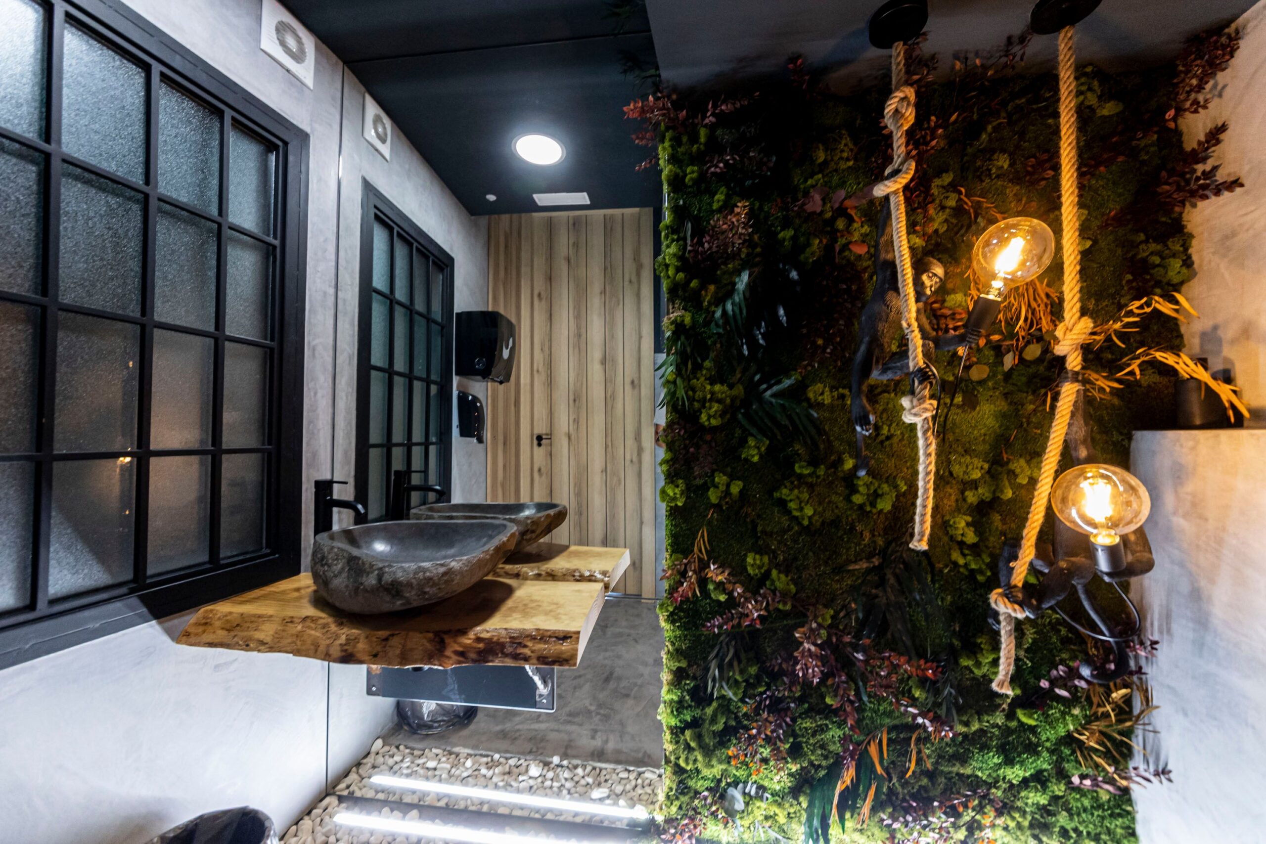 En los aseos, se ha puesto especial atención al diseño funcional y estético. Los lavabos de roca sobre un tablero de madera natural añaden un toque orgánico, mientras que el jardín vertical en el fondo aporta frescura y un contraste visual que invita a una experiencia única en cada rincón. Los detalles de gravilla bajo los lavabos refuerzan la idea de un ambiente natural y relajante, donde cada elemento está pensado para crear un conjunto armonioso.