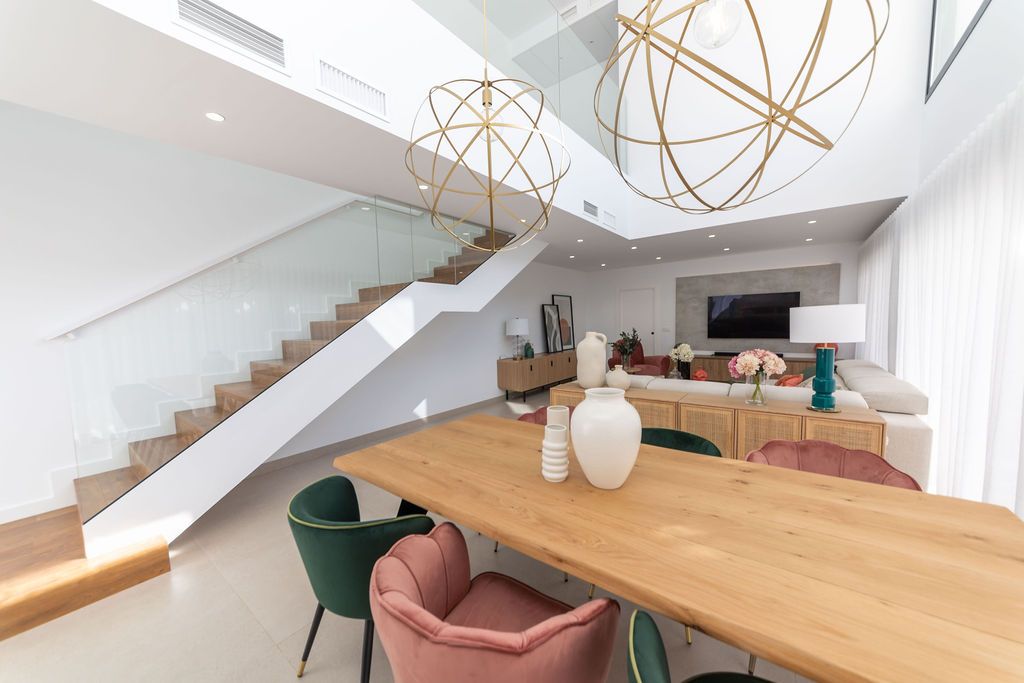 En este proyecto de interiorismo al entrar, se observa un amplio salón de concepto abierto, iluminado por grandes ventanales que permiten la entrada de luz natural, creando una atmósfera cálida y luminosa. El mobiliario, en tonos suaves como el verde esmeralda y el rosa pálido, se combina con detalles en madera natural. El comedor, con una mesa de madera de tono claro y sillas de terciopelo, es el centro de atención, mientras que las lámparas de grandes dimensiones suspendidas sobre él, aportan un toque contemporáneo y sofisticado. La decoración, con flores frescas y piezas de cerámica, hacen que cada rincón se sienta único.