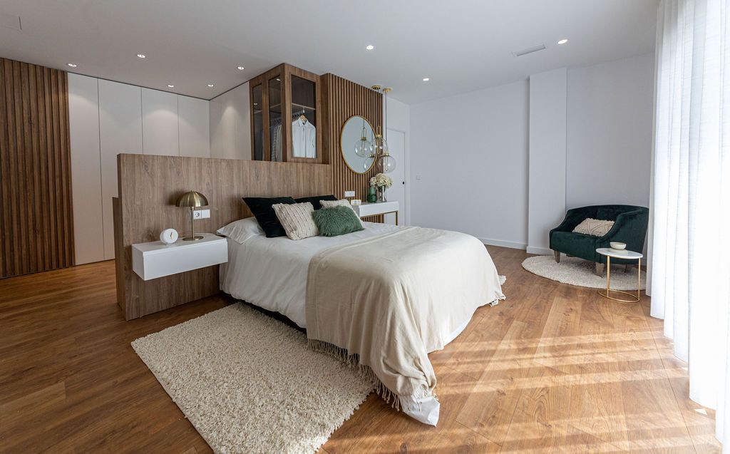 En el dormitorio principal, el diseño se caracteriza por un cabecero de madera que a su vez sirve de almacenaje, tocador y separador con el vestidor. Los detalles en dorado y verde, junto a completan la estancia.