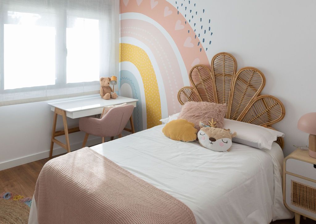 Para los más pequeños tenemos, la habitación infantil de la niña que presenta un mural de arcoíris en tonos suaves tras un cabecero de abanico hecho con cañas en vuelto en detalles rosa empolvado, mientras que por otro lado, tenemos el cuarto del niño con un un mural en tonos verdes inspirado en la selva que combina con los elemento textiles del dormitorio en verde además tiene un área de juegos con un tipi beige.